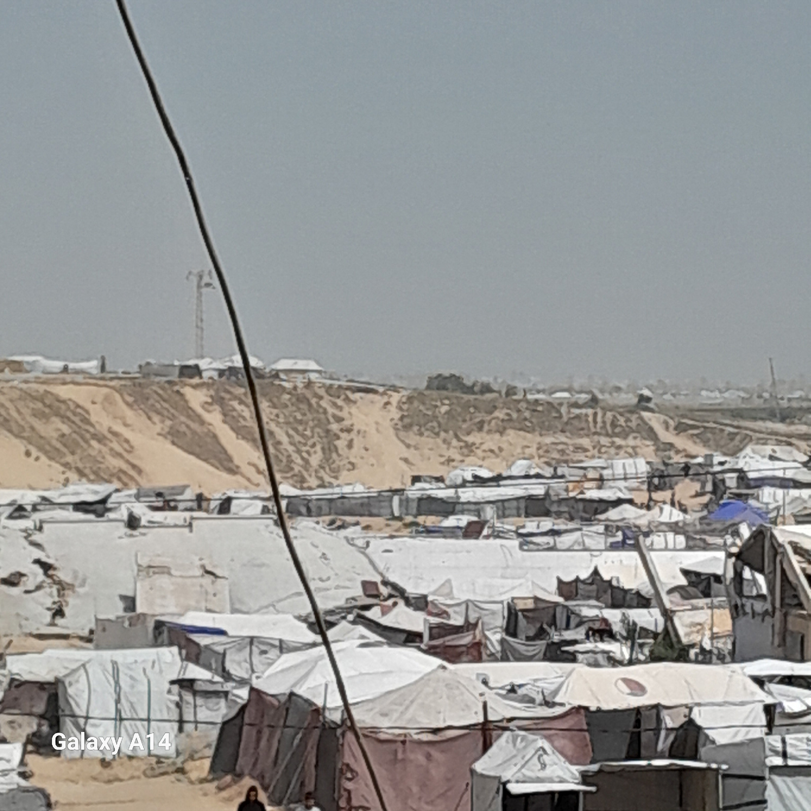 The image, when correctly oriented, presents a wide view of a densely packed encampment, likely a refugee or displacement camp, set against a desolate, sandy landscape under an overcast sky. Given the…read more