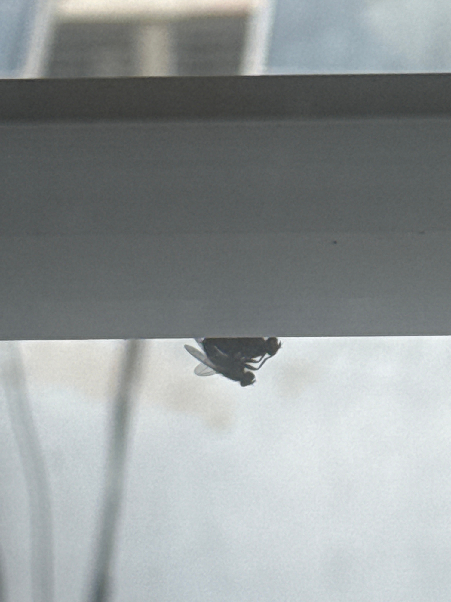 A large insect, possibly a cicada, clings to a vertical gray surface. The background is blurry, with a structure visible in the distance on the left and power lines visible on the right. The location…read more