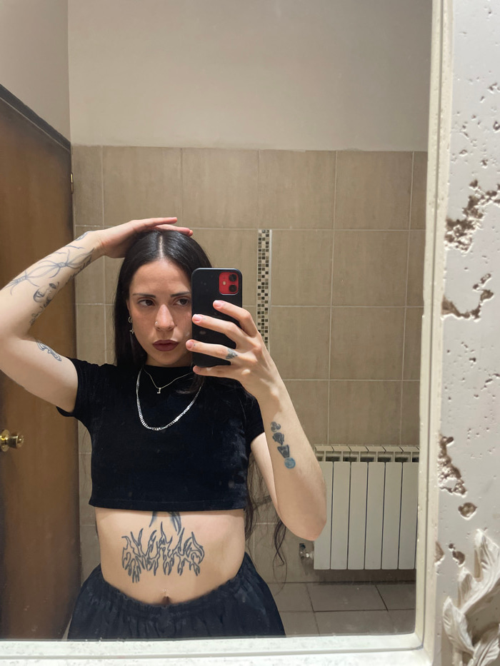 A mirror selfie depicts a female subject inside a room, likely a bathroom, in Ushuaia, Argentina. The subject has long dark hair, dark red lipstick, and a small ring piercing in her left nostril. She…read more