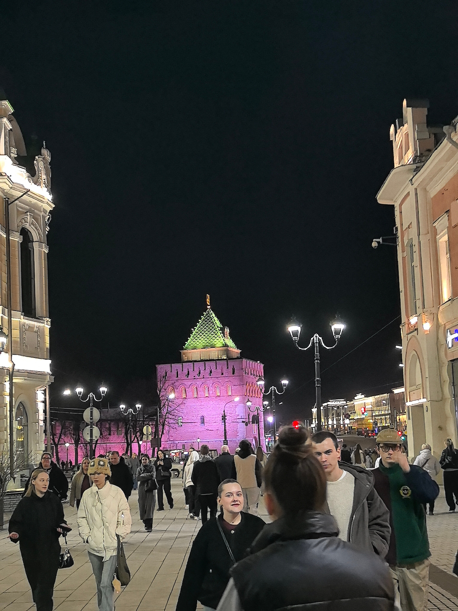 The image captures a street scene in Nizhny Novgorod, Russia, at night. A crowd of pedestrians are walking on a paved walkway lined by buildings on either side. The most prominent structure is a brigh…read more