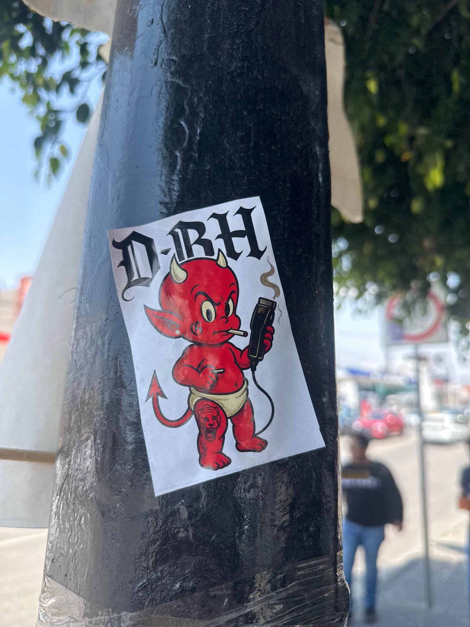 A sticker featuring a mischievous red devil baby is affixed to a textured, black surface, possibly a metal pole or railing. The devil baby, with prominent horns, yellow eyes, and a pointed tail, wearsβ¦read more