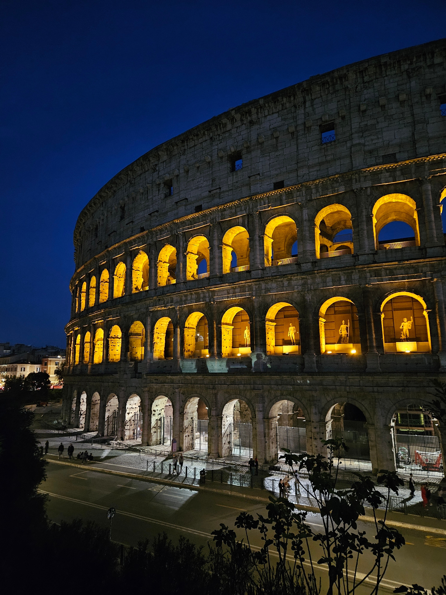 The image depicts the Colosseum in Rome, Italy, at night. The Colosseum's architecture is illuminated, showing its arched facade. Some arches house illuminated statues. A road runs alongside the Colos…read more