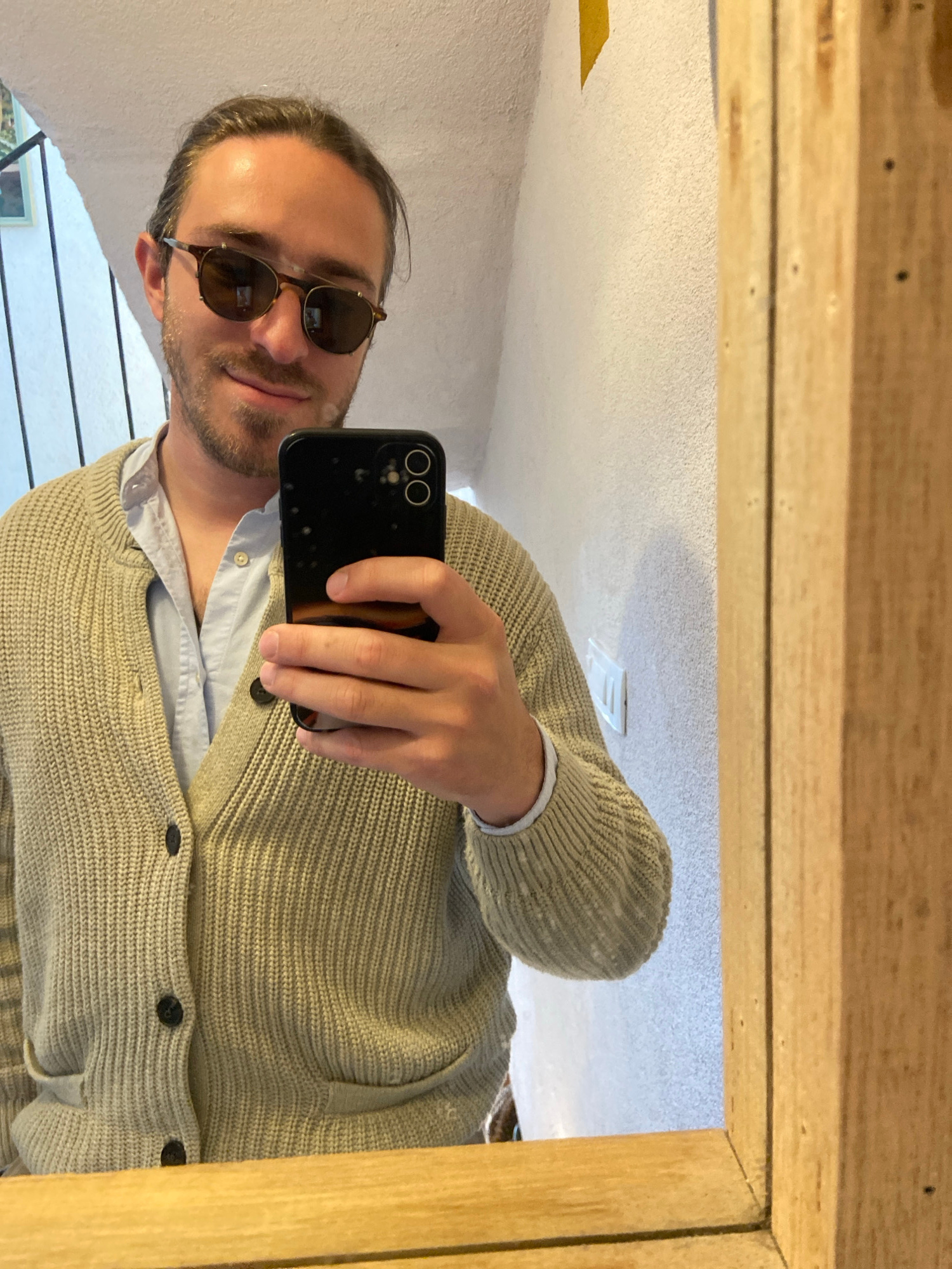 A man is taking a selfie in a mirror. He has light brown hair, a beard, and is wearing sunglasses and a beige cardigan over a light blue shirt. He is holding a black smartphone in his right hand. The…read more