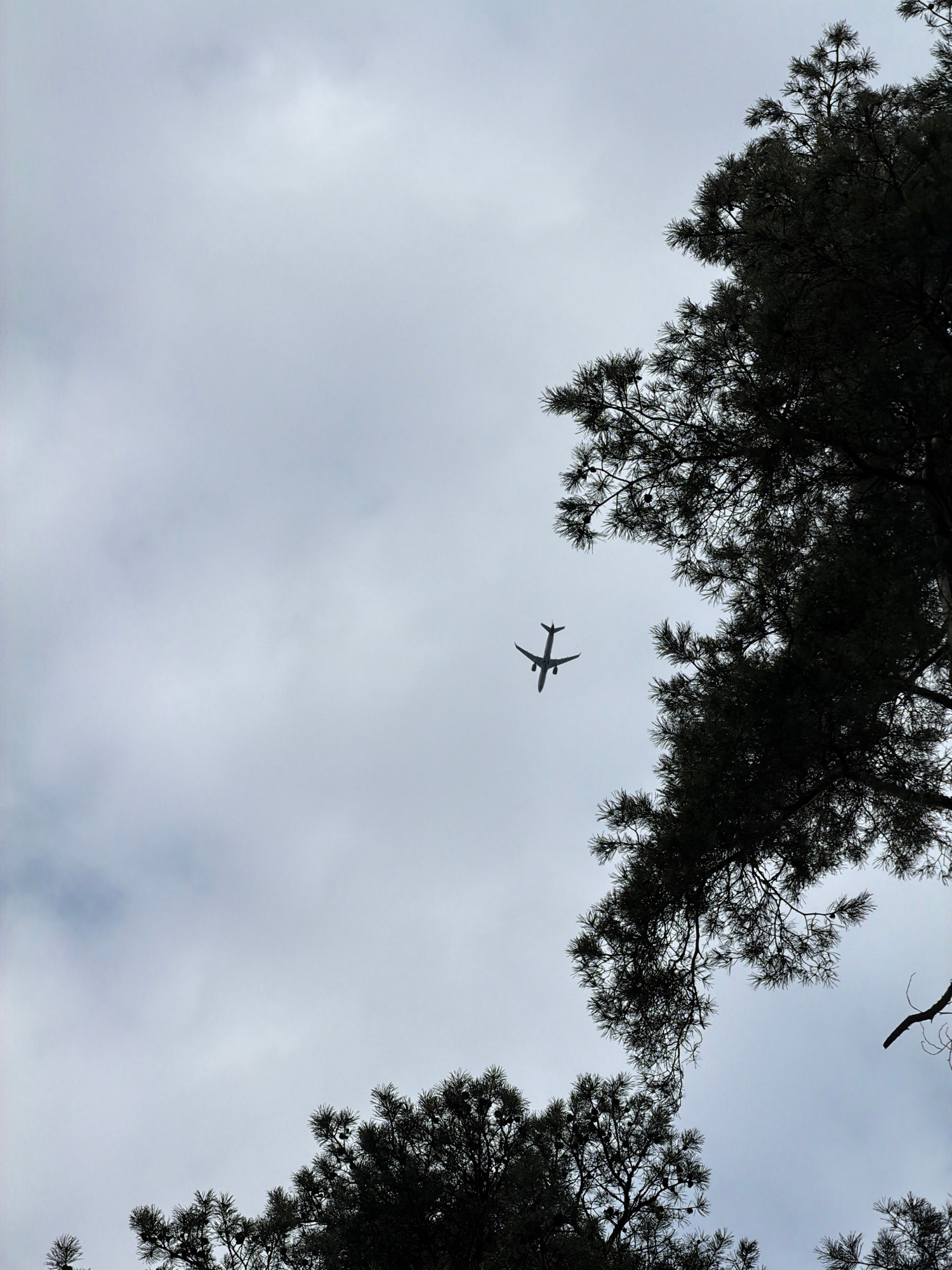 A photograph taken from a ground-level perspective in Priežlejas, Latvia, captures a twin-engine passenger aircraft in flight against an overcast sky. The aircraft, rendered as a dark silhouette, is p…read more