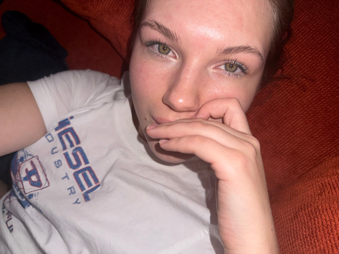 A person lies on a reddish-brown couch, wearing a white t-shirt with blue lettering that reads "Diesel Industry". One hand is raised, partially obscuring the face, while the eyes are open, looking dir…read more