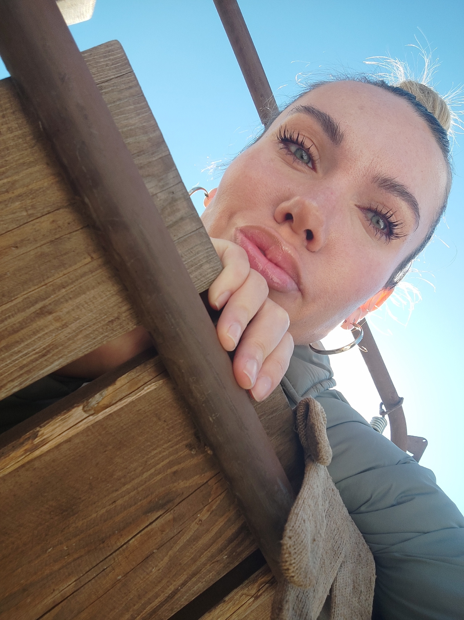 A woman poses close to the camera from a low angle, holding onto a weathered, brown wooden structure. She has her blonde hair in a bun and wears gold hoop earrings, visible against the bright blue sky…read more