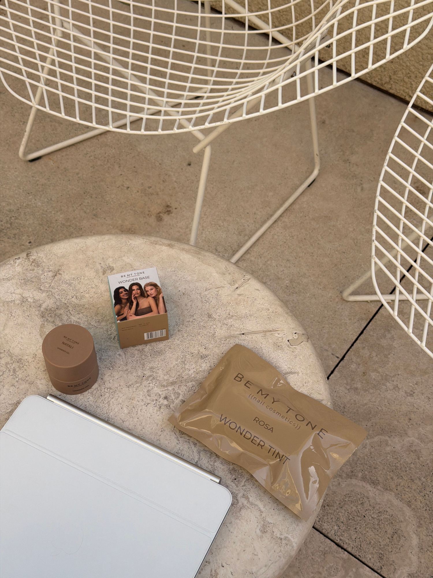 An overhead shot captures an outdoor scene, likely a patio or balcony in Tel-Aviv, Israel, featuring modern furniture and cosmetic products. Two white wire-mesh chairs are partially visible, one promi…read more