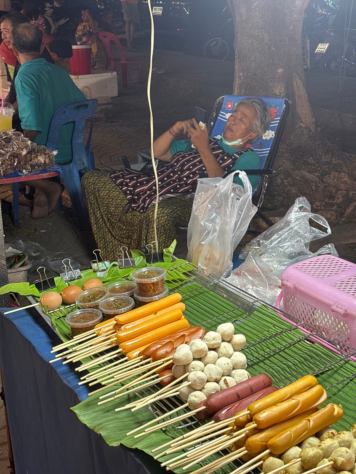 This media file captures a nighttime scene at a street food stall in what appears to be a market in Choeng Thale, Thailand. The primary subject is an elderly woman, possibly the vendor, who is asleep…read more
