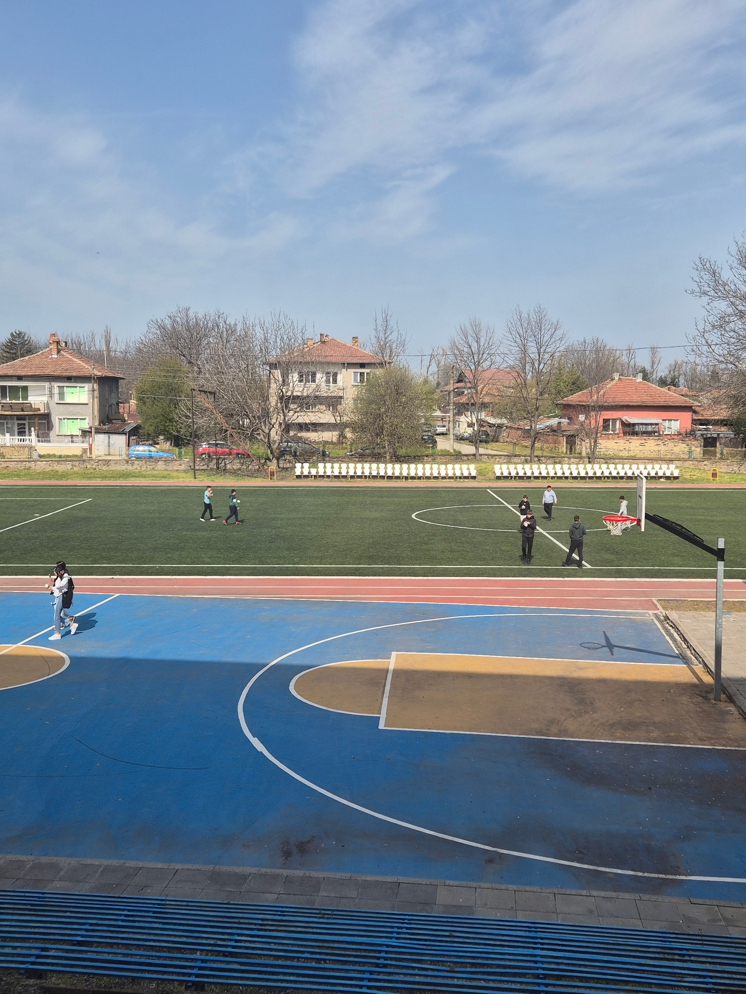 The image depicts an outdoor sports complex in Pavlikeni, Bulgaria, featuring a basketball court with blue and tan painted sections and white lines. Adjacent to the basketball court is a green artific…read more