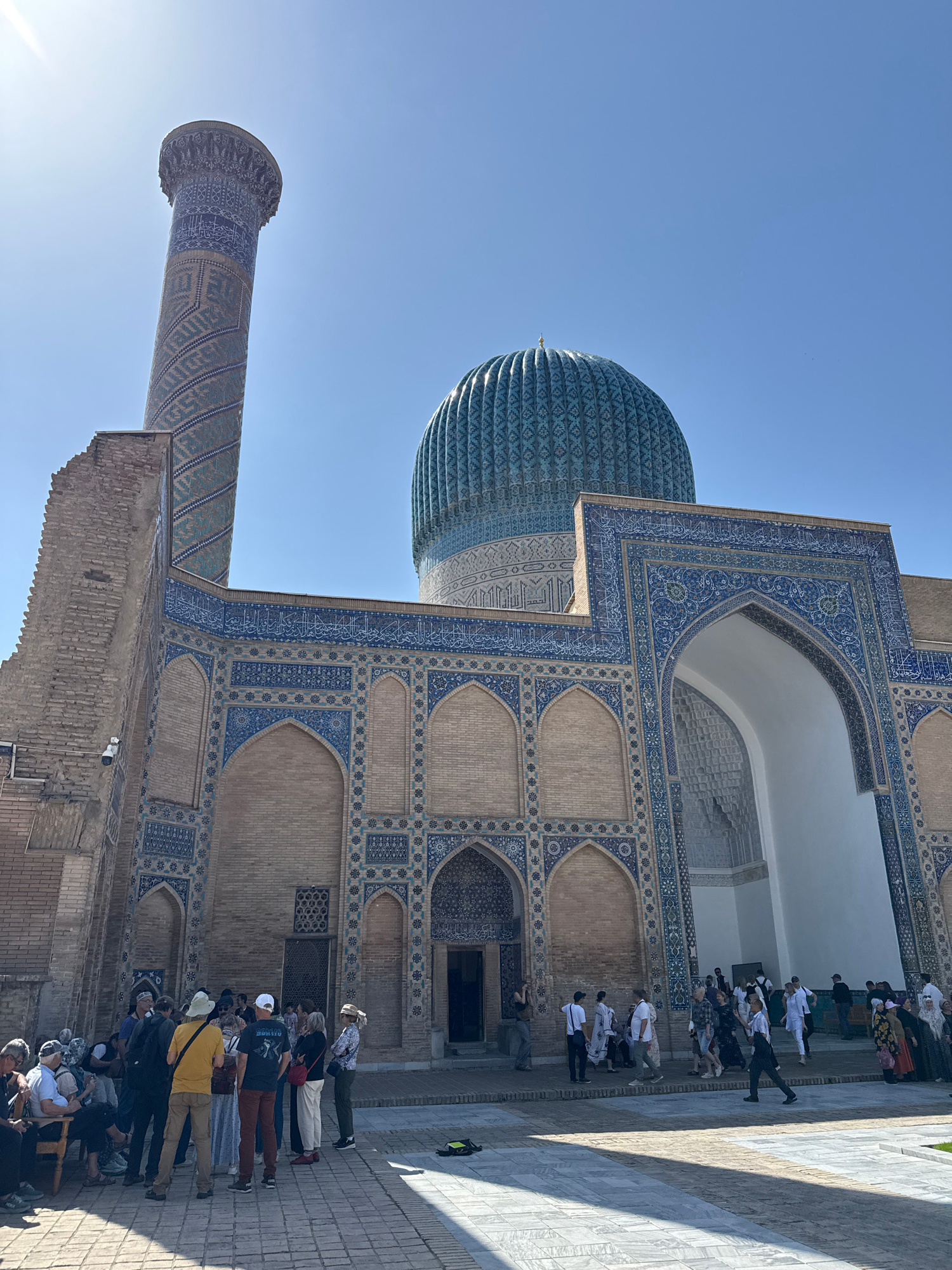 The image depicts a vertical view of Gur-e-Amir in Samarkand City, Uzbekistan. Architectural features include a large, fluted turquoise dome, a minaret with intricate blue tilework, and a building fac…read more
