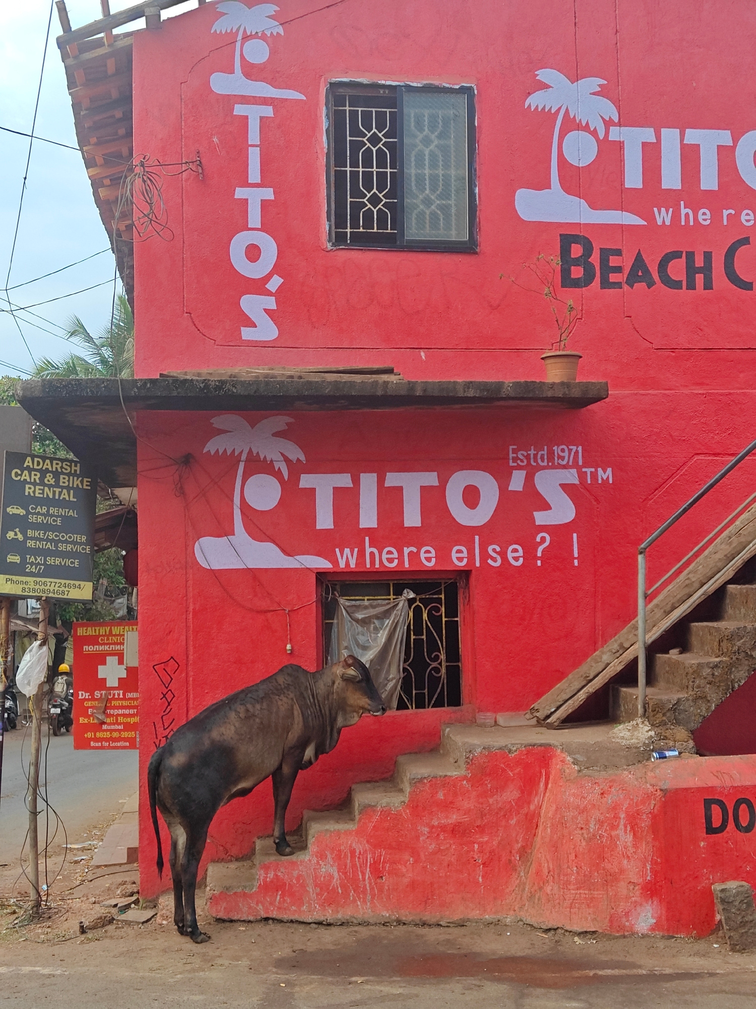 Here is a description of the image: The photograph shows the exterior of a two-story building in Arambol, India. The building is painted a vibrant red and features white painted logos of "TITO'S", in…read more