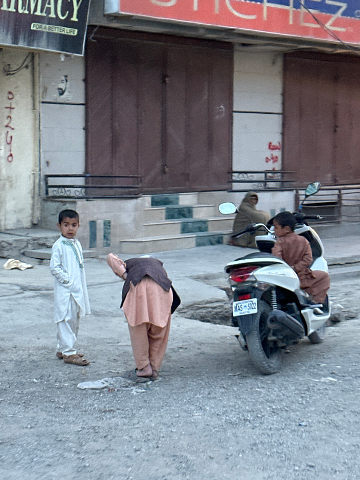 The image portrays an outdoor street scene in Quetta City Tehsil, Pakistan, during daylight. In the background, a building features two closed, dark brown roll-down metal shutters. Above the left shut…read more