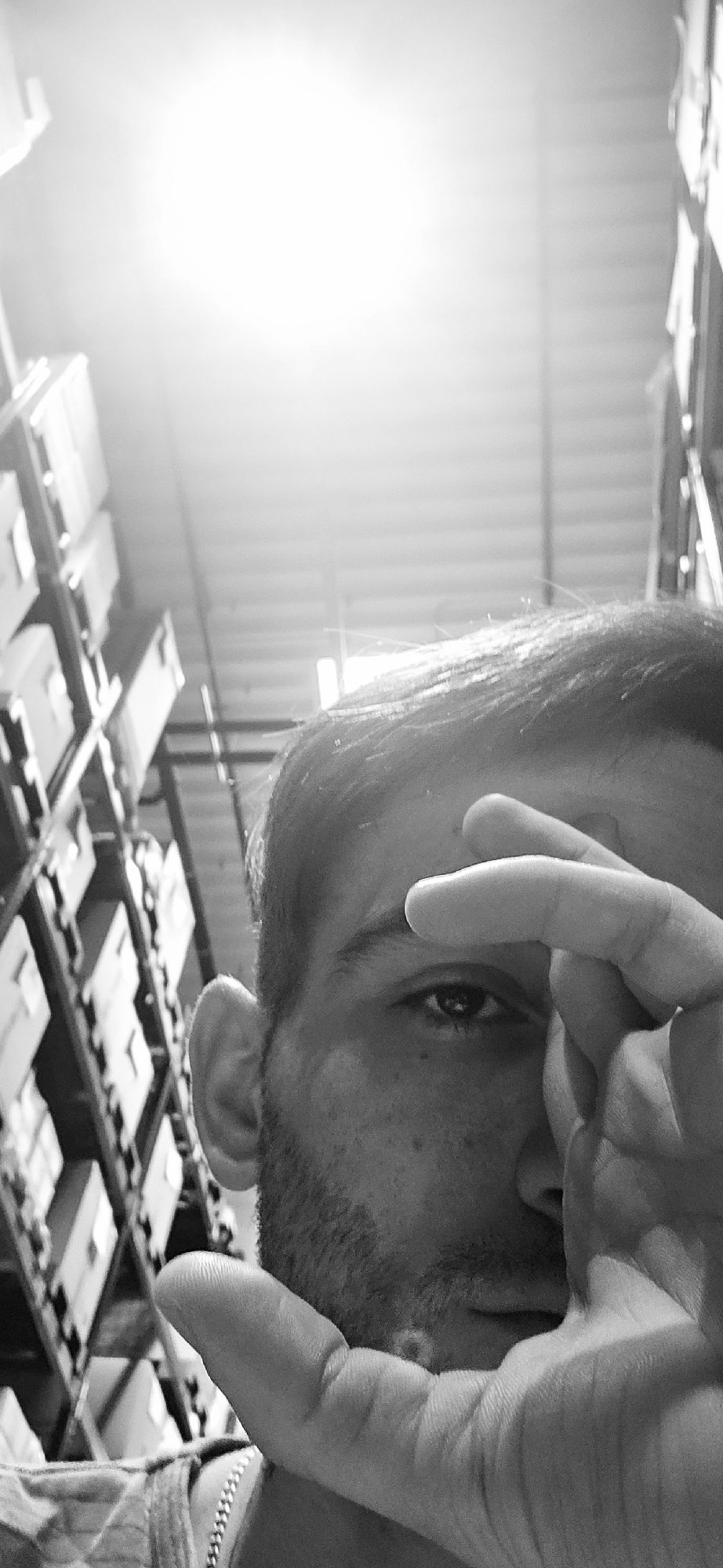 A monochrome photograph shows a person from a low angle, partially obscured by their hand. The person's head is tilted downward, and only one eye is clearly visible. Their hair is swept back. The hand…read more