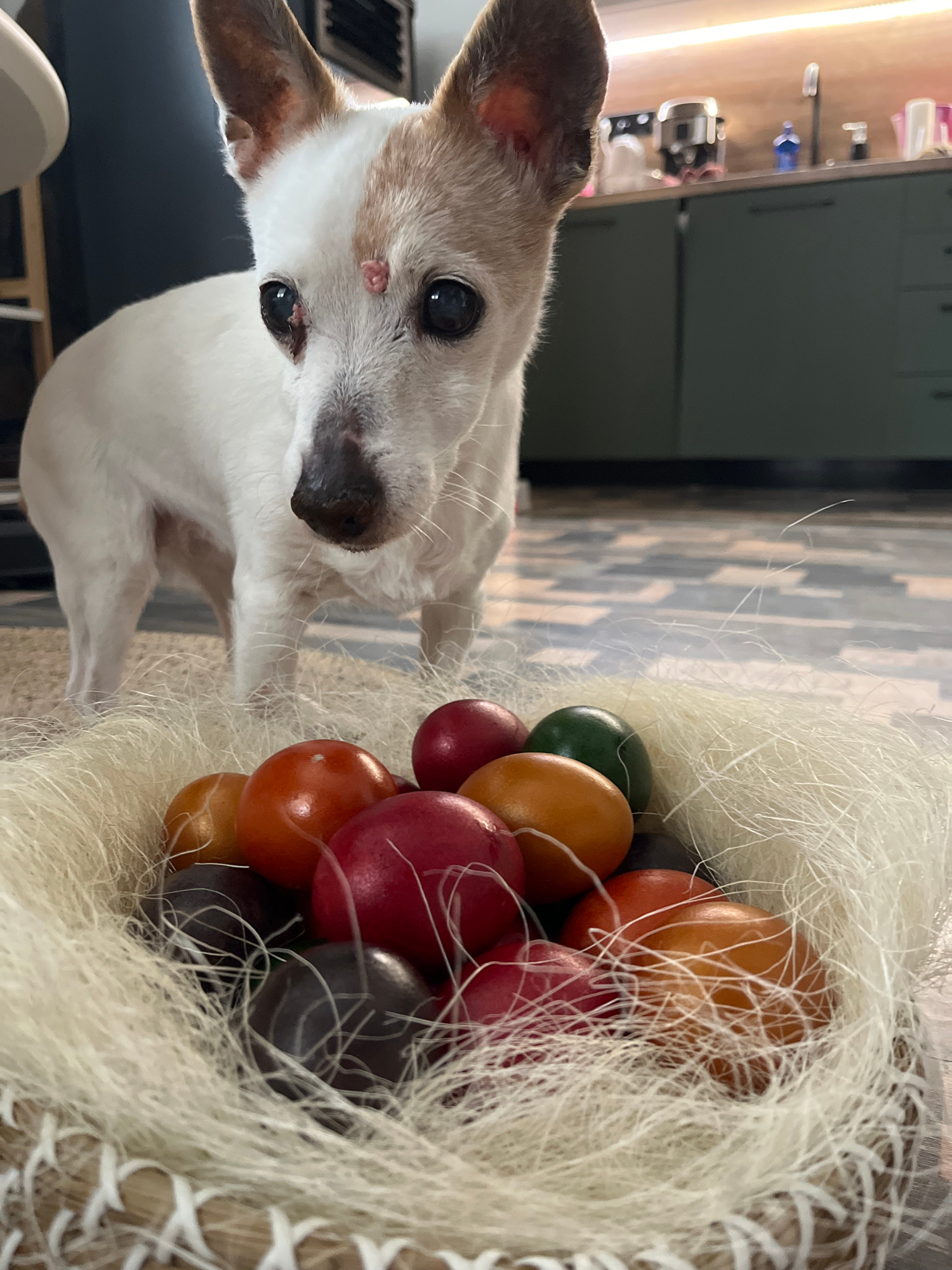 A medium shot presents a white and tan terrier dog positioned near a basket of wooden, painted eggs in various colors including red, orange, green, and black. The basket itself is adorned with a white…read more