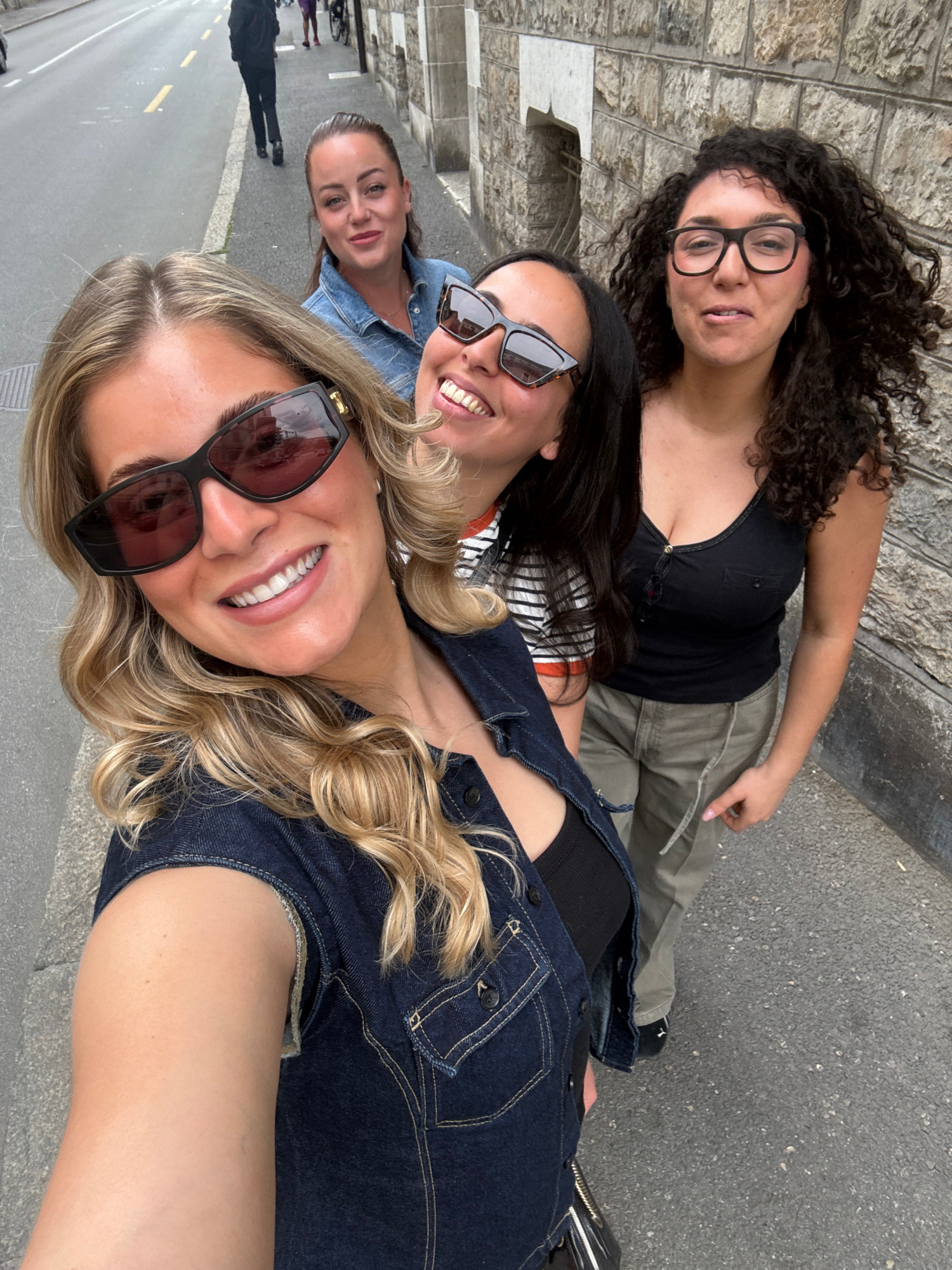 Four women are posing for a selfie on a city street. The woman closest to the camera wears a dark denim jacket and large black sunglasses. She has blonde hair styled in loose waves and is smiling broa…read more