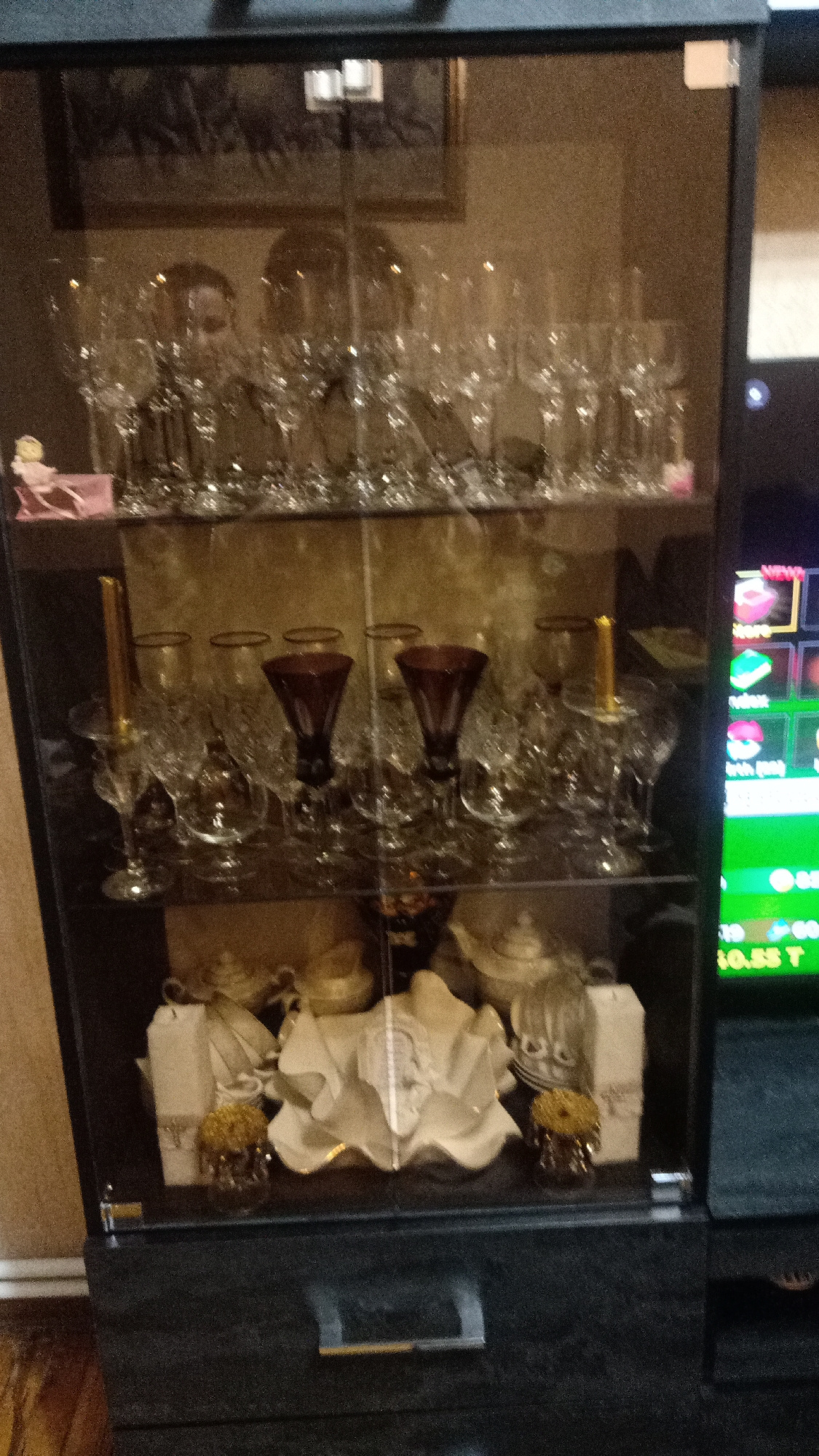 A glass-fronted cabinet houses a collection of glassware, porcelain, and decorative items. The cabinet is dark gray and features a drawer at the bottom. The top shelf displays numerous champagne flut…read more