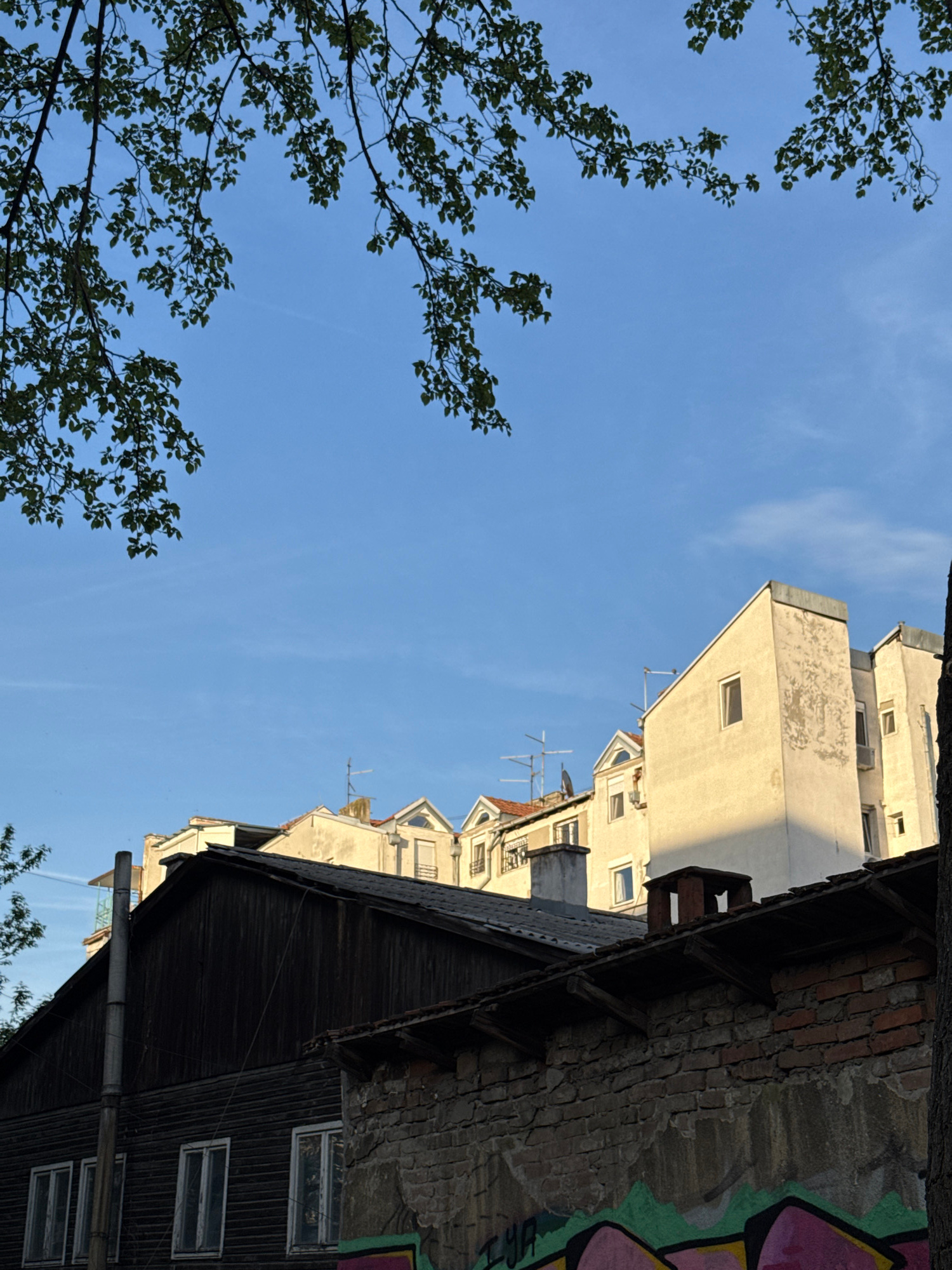 The image is a low-angle shot looking up at buildings and sky in Belgrade, Serbia. On the left, branches with green leaves frame the view. The sky is blue with faint white clouds. On the right, there…read more