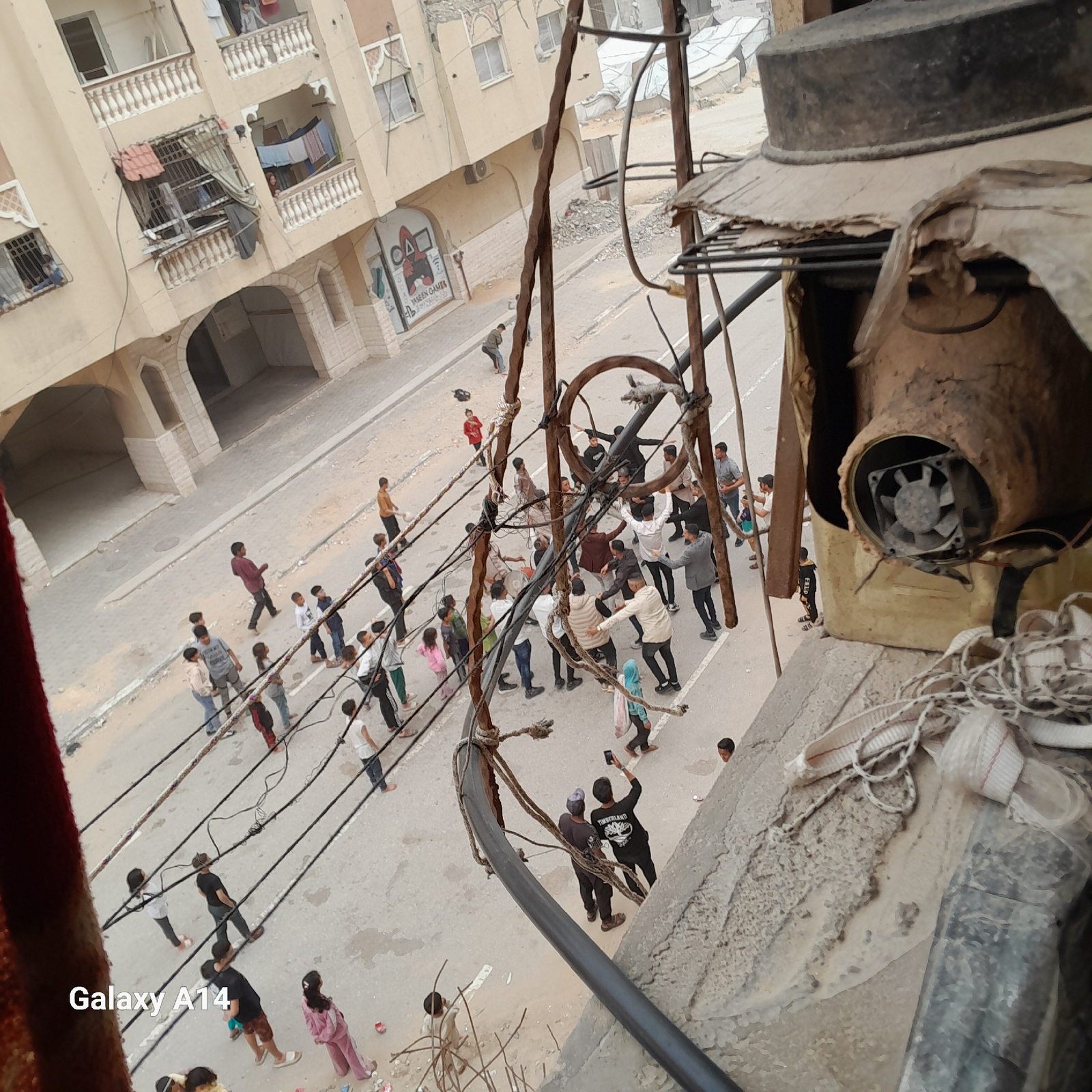 The image, taken from a high vantage point looking down, depicts a street scene in Khan Yunis, Palestinian Territory, with numerous people gathered for what appears to be a communal prayer during dayt…read more