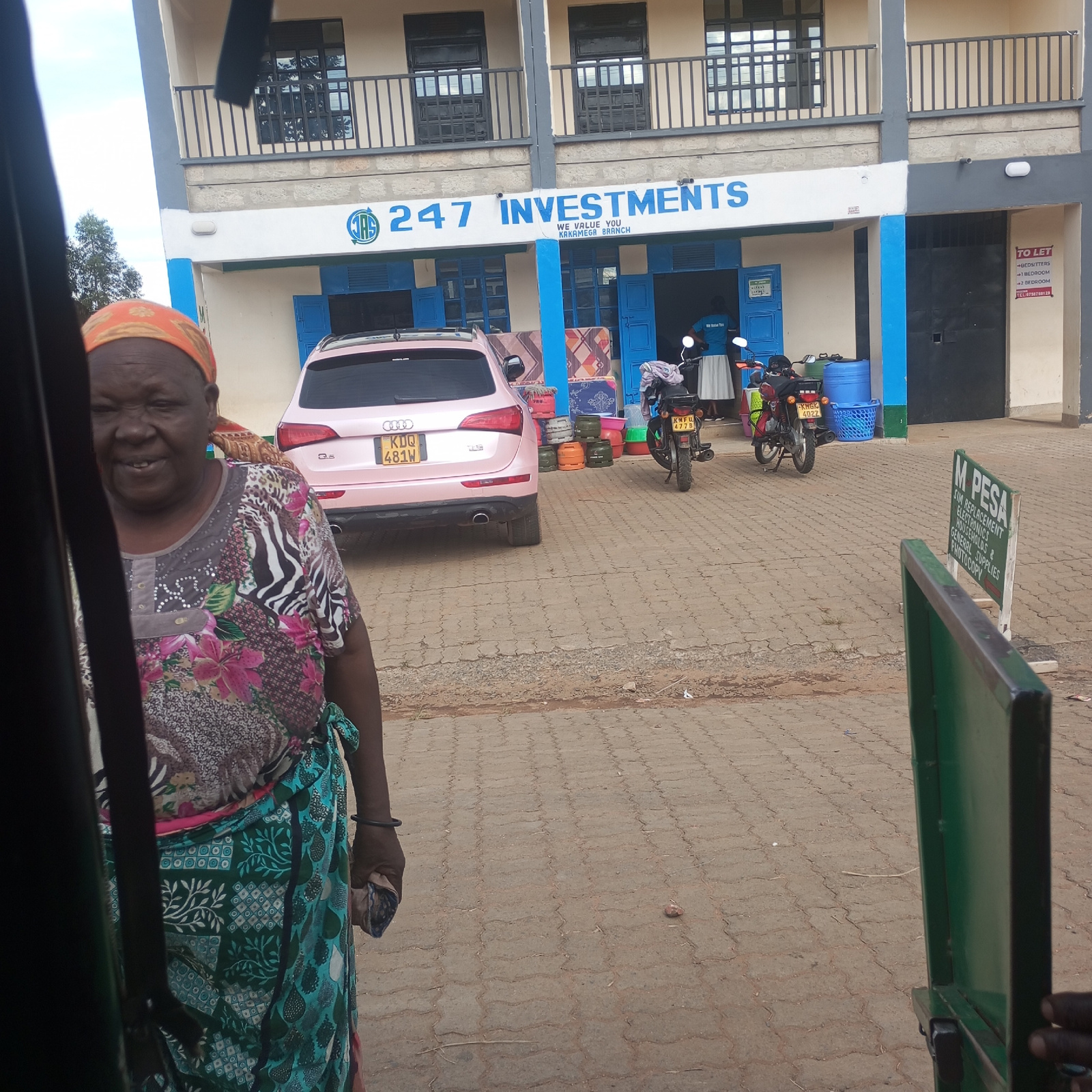 The image shows a view from inside a vehicle of a woman standing near a street in Sheywe ward, Kenya. The woman wears a colorful floral top, a green and blue patterned skirt, and an orange headscarf.…read more