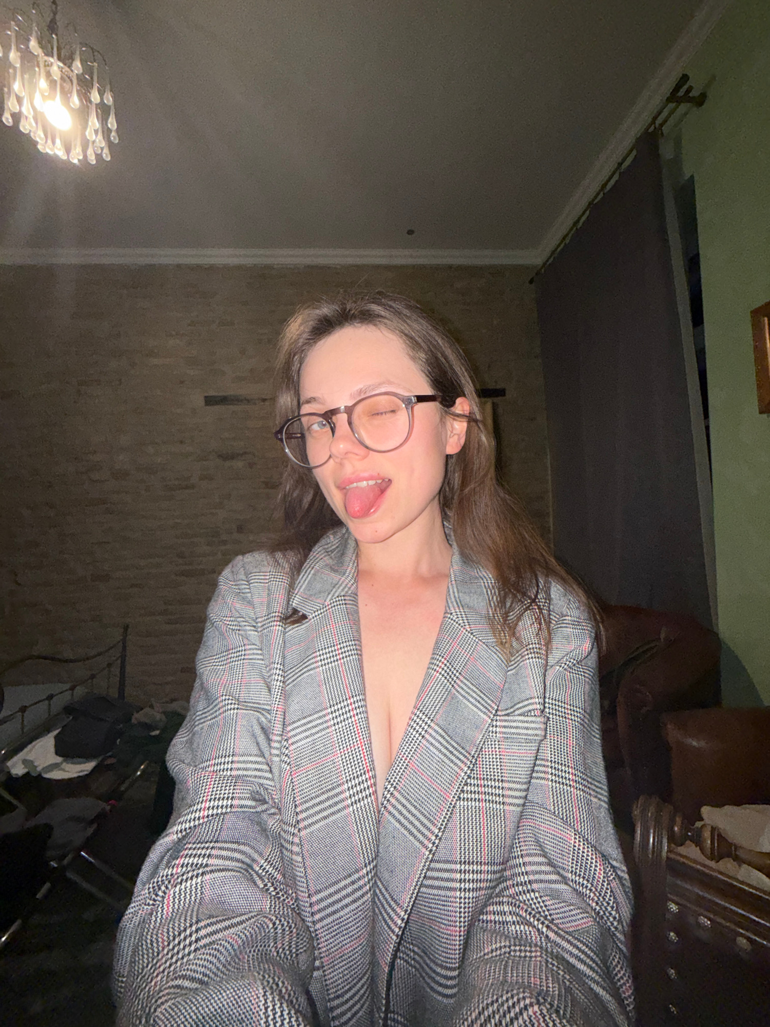 A young woman wearing a plaid blazer and round glasses sticks out her tongue. The location is difficult to determine as the lighting is dim, and only portions of the background are visible. There is a…read more