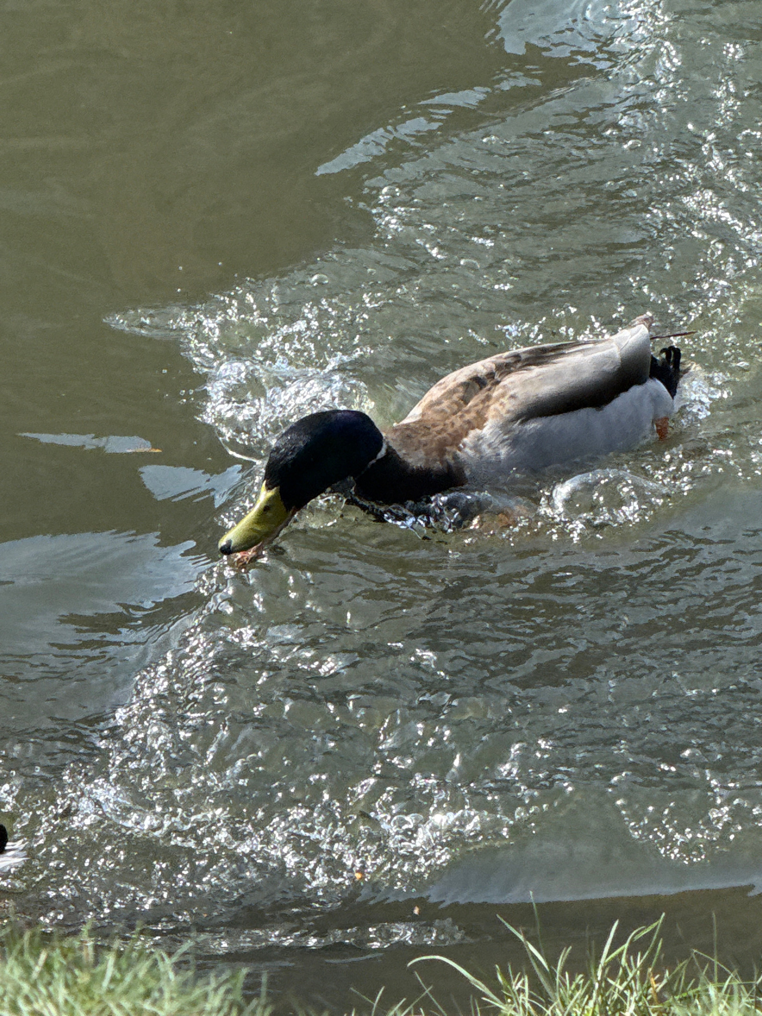 A male mallard duck is diving head-first into a body of water. The duck has a dark green head, yellow beak, brown and grey body, and its tail is raised out of the water. The water is slightly choppy,…read more
