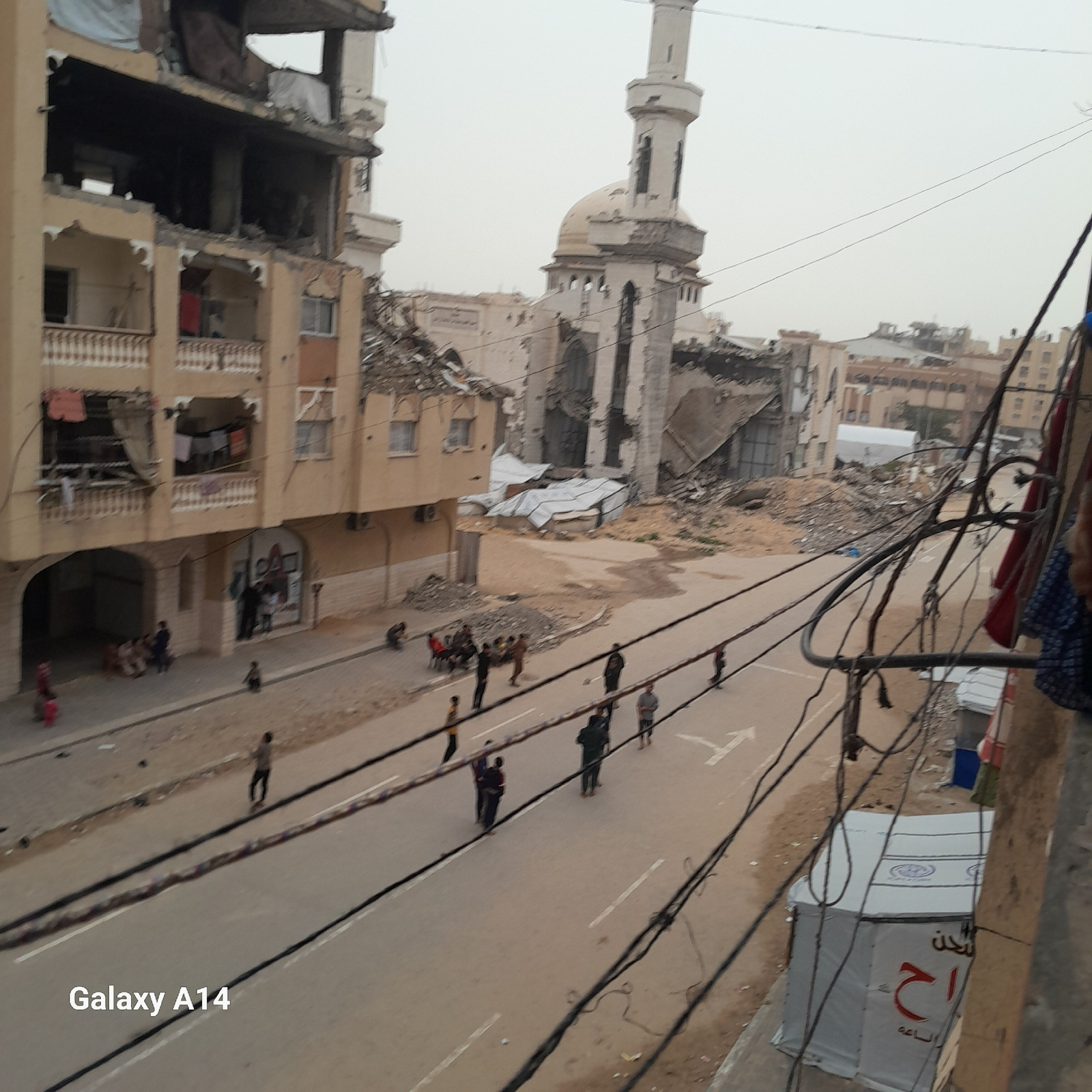 The image depicts a scene in Khan Yunis, Palestinian Territory, characterized by significant destruction. Buildings are heavily damaged, with exposed interiors and collapsed sections. A mosque with a prominent minaret stands amidst the ruins. Several individuals are walking along a street. Overhead, power lines are strung across the view. Debris and rubble are scattered throughout the scene. | Open Wire