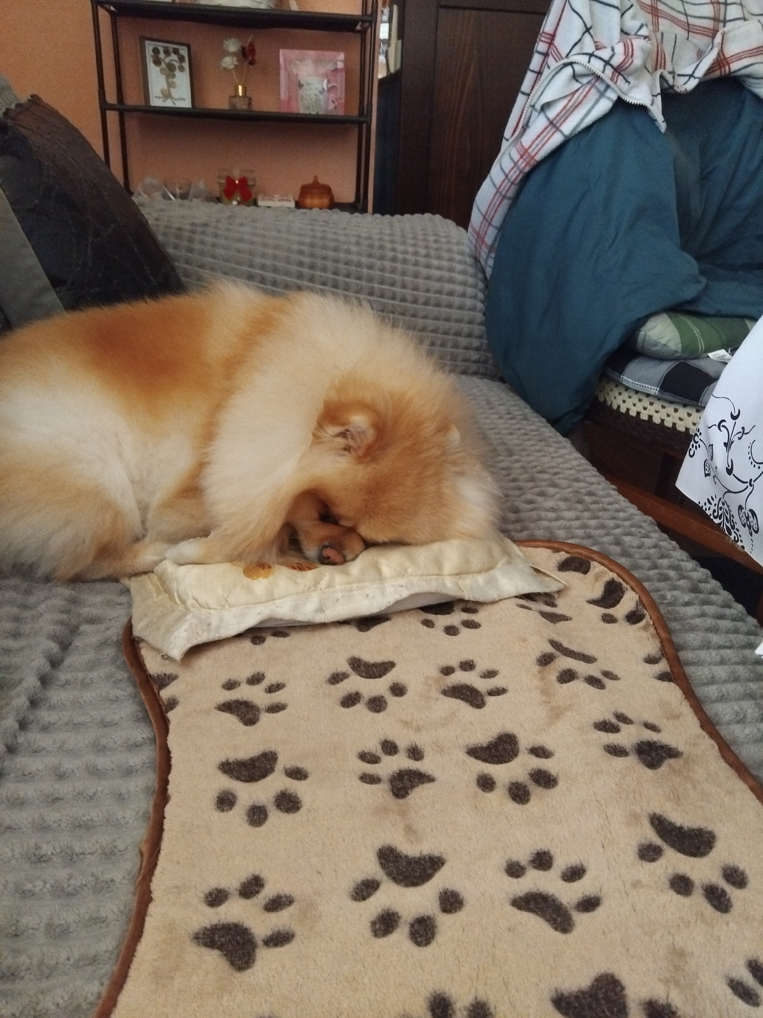 A Pomeranian dog is curled up sleeping on a gray textured couch in Apriltsi, Bulgaria. The dog is positioned next to a beige blanket patterned with brown paw prints, using a cream-colored pillow as a headrest. Beside the couch, a black metal shelving unit holds framed pictures. Part of a dresser and various folded clothes are visible above the couch. | Open Wire