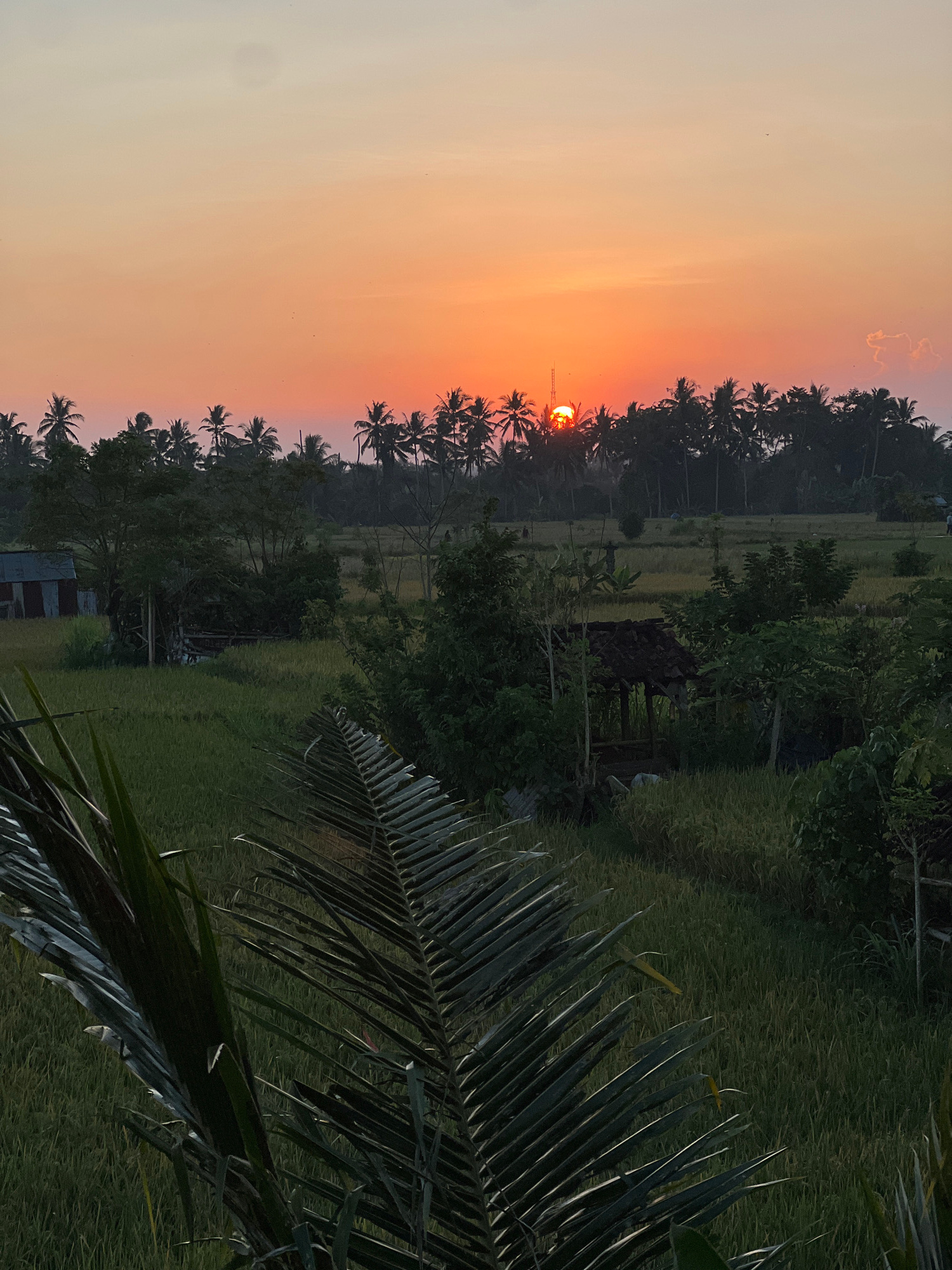 The image depicts a sunset in Ubud District, Indonesia. The sun is partially obscured by a line of palm trees, casting an orange and pink glow in the sky. The foreground features a rice paddy field wi…read more
