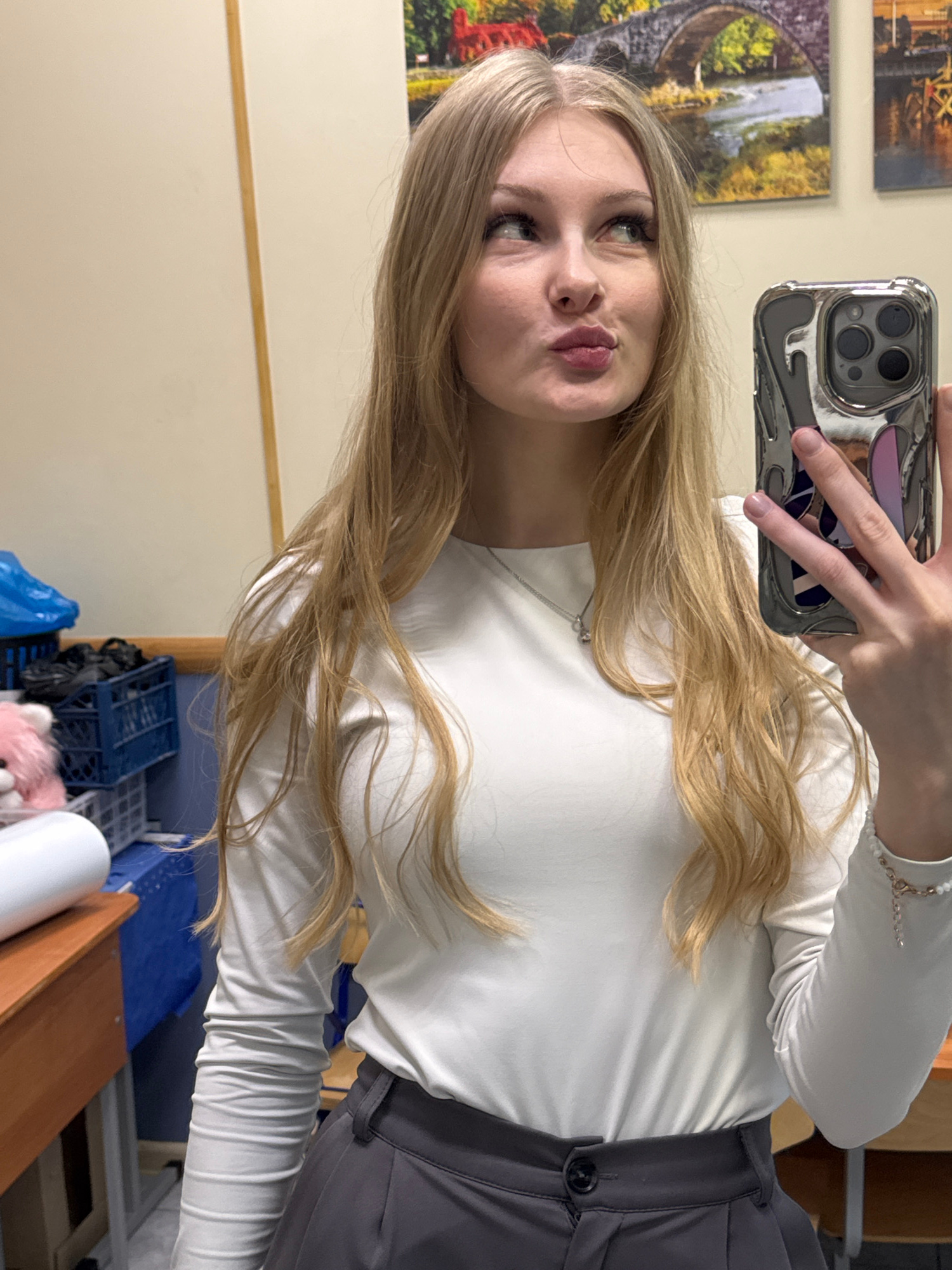 A blond-haired woman in a white long-sleeved shirt and grey pants is taking a selfie in an indoor setting. She is holding a metallic phone in her right hand. The background includes artwork on a wall,…read more