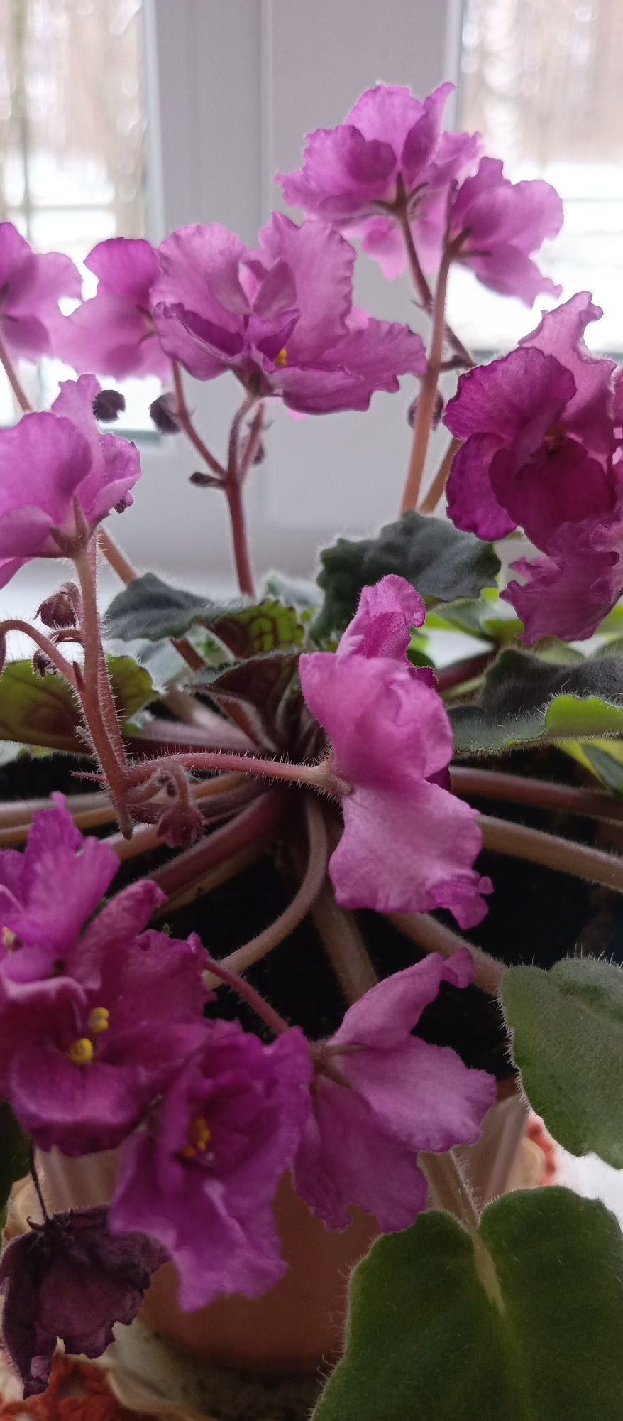 A close-up photograph shows a flowering African violet plant in a pot. The plant has vibrant pink-purple flowers with yellow centers. The leaves are a dark green and have a fuzzy texture. The stems ar…read more