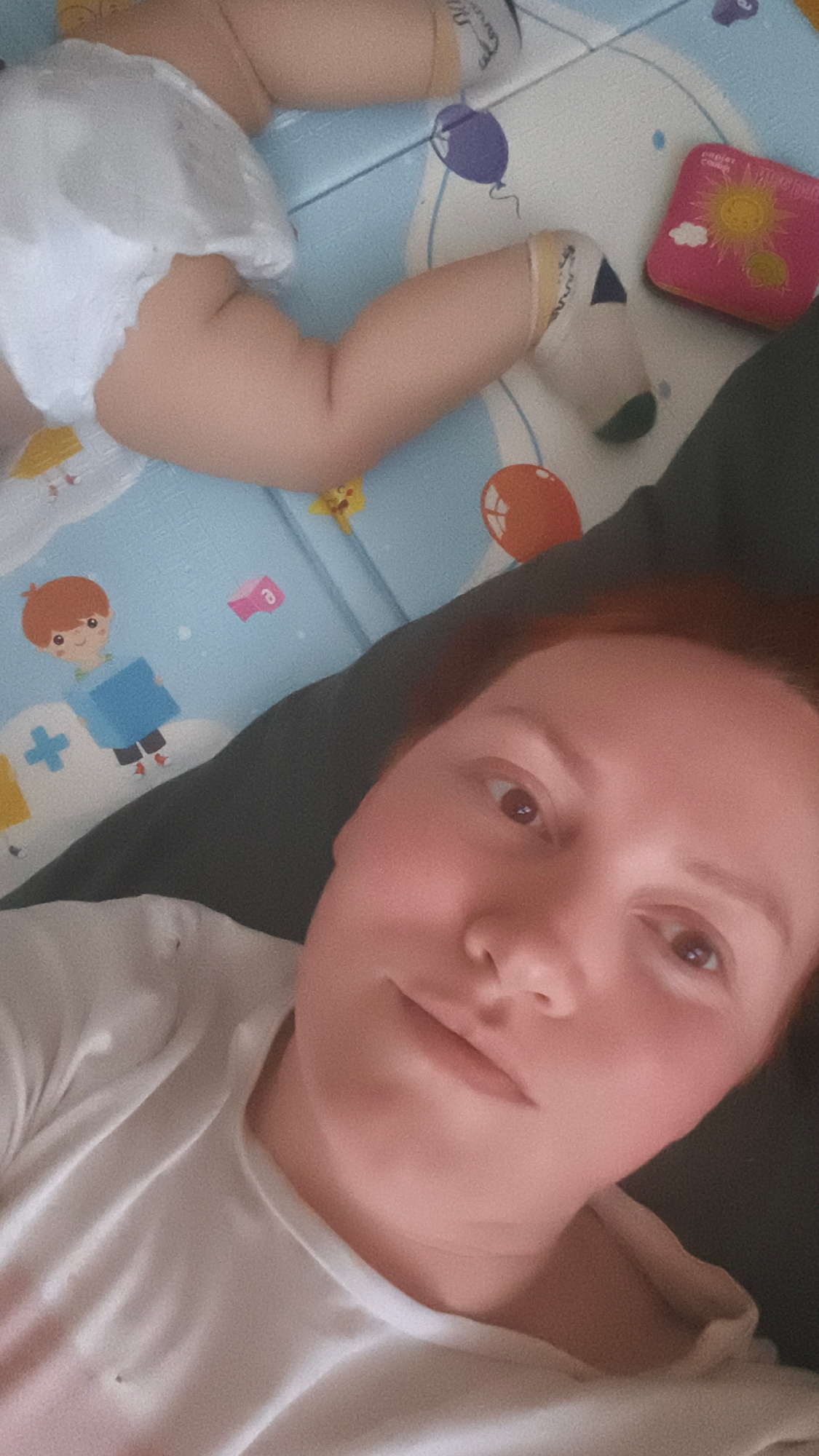 The image shows a woman lying on a dark grey surface, taking a selfie. Parts of a baby are visible on a colorful play mat behind her. The mat has a light blue base with images of balloons, a cartoon b…read more