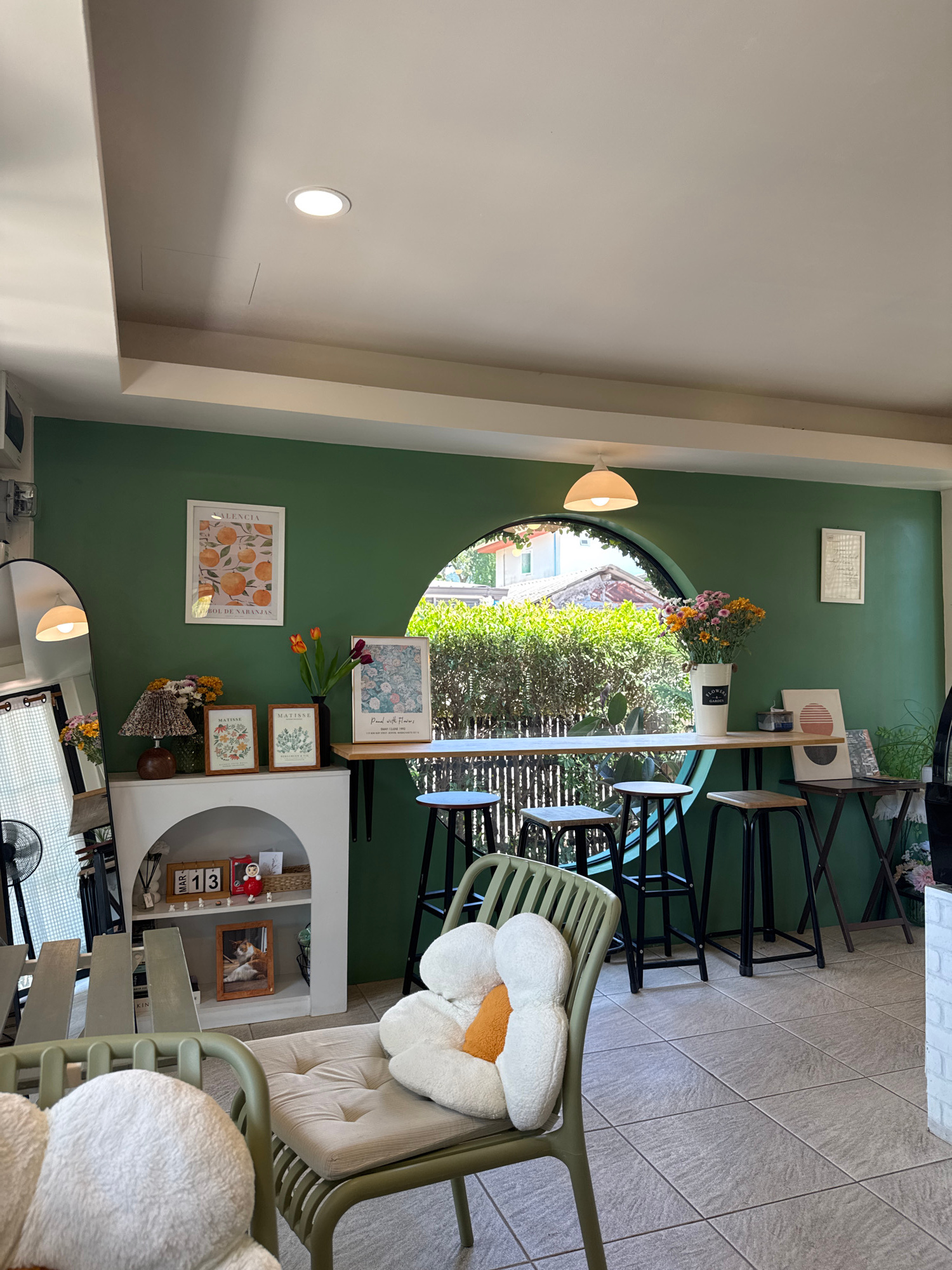 The image shows the interior of a cafe or shop in Choeng Thale, Thailand. The walls are painted green, and a large circular window provides a view of lush outdoor greenery. Several framed artworks and…read more