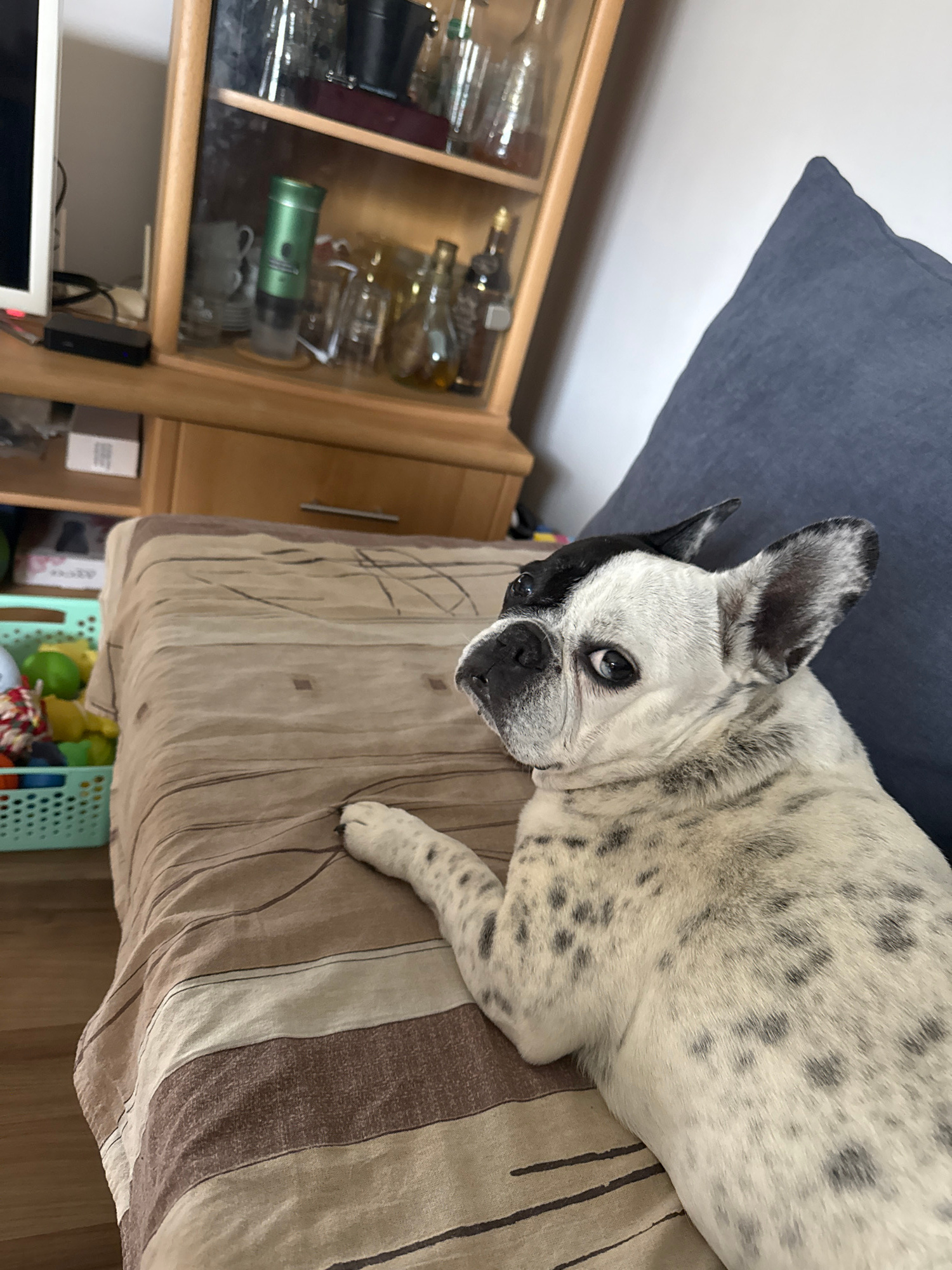 A light-colored, spotted French Bulldog is lying on a striped surface (possibly a bed or couch). The dog has black markings around one eye and ear. A blue cushion or pillow is behind the dog. To the l…read more