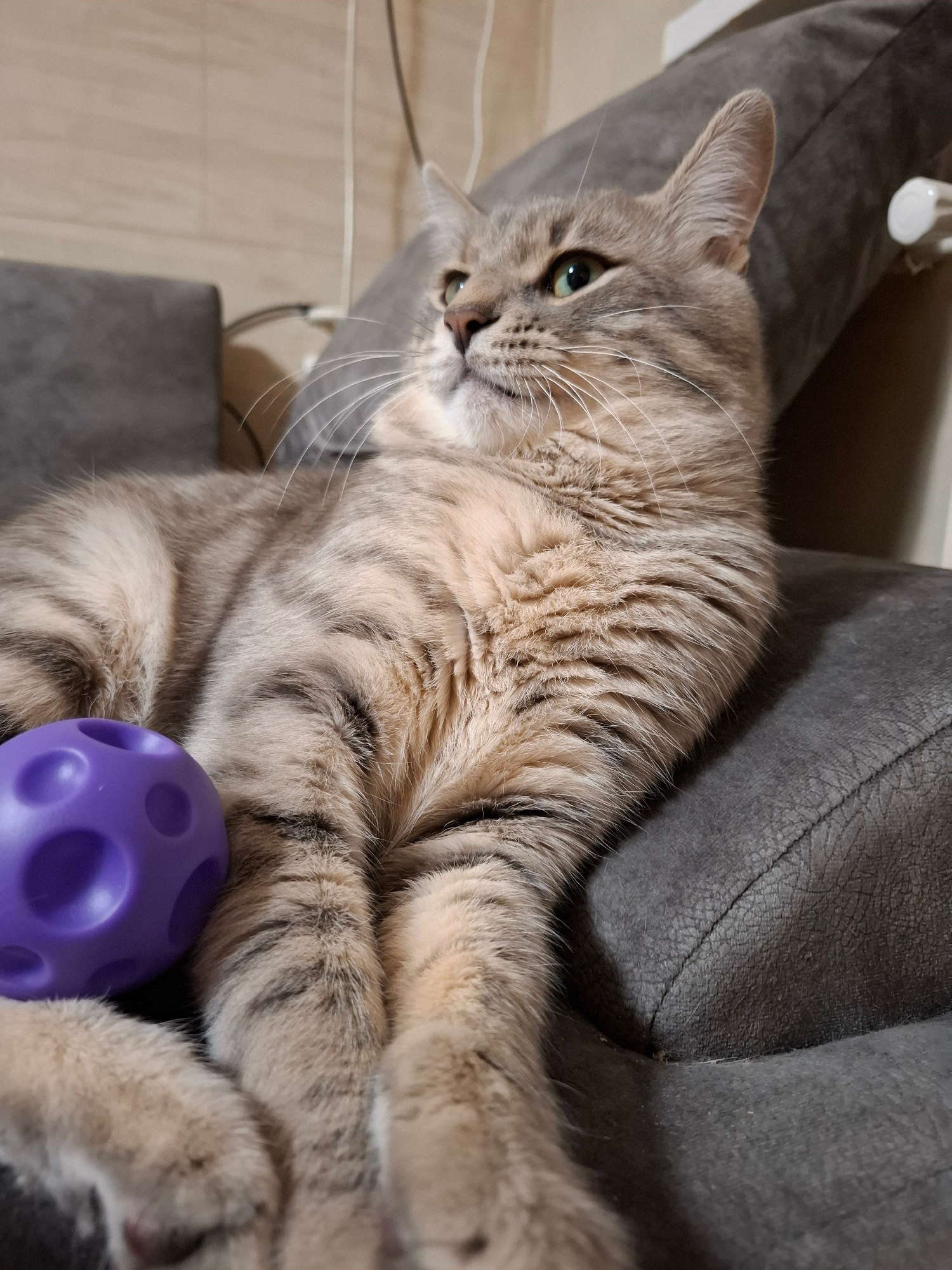 A tan tabby cat is lying on a gray leather chair with a purple ball. The location cannot be determined from the image.