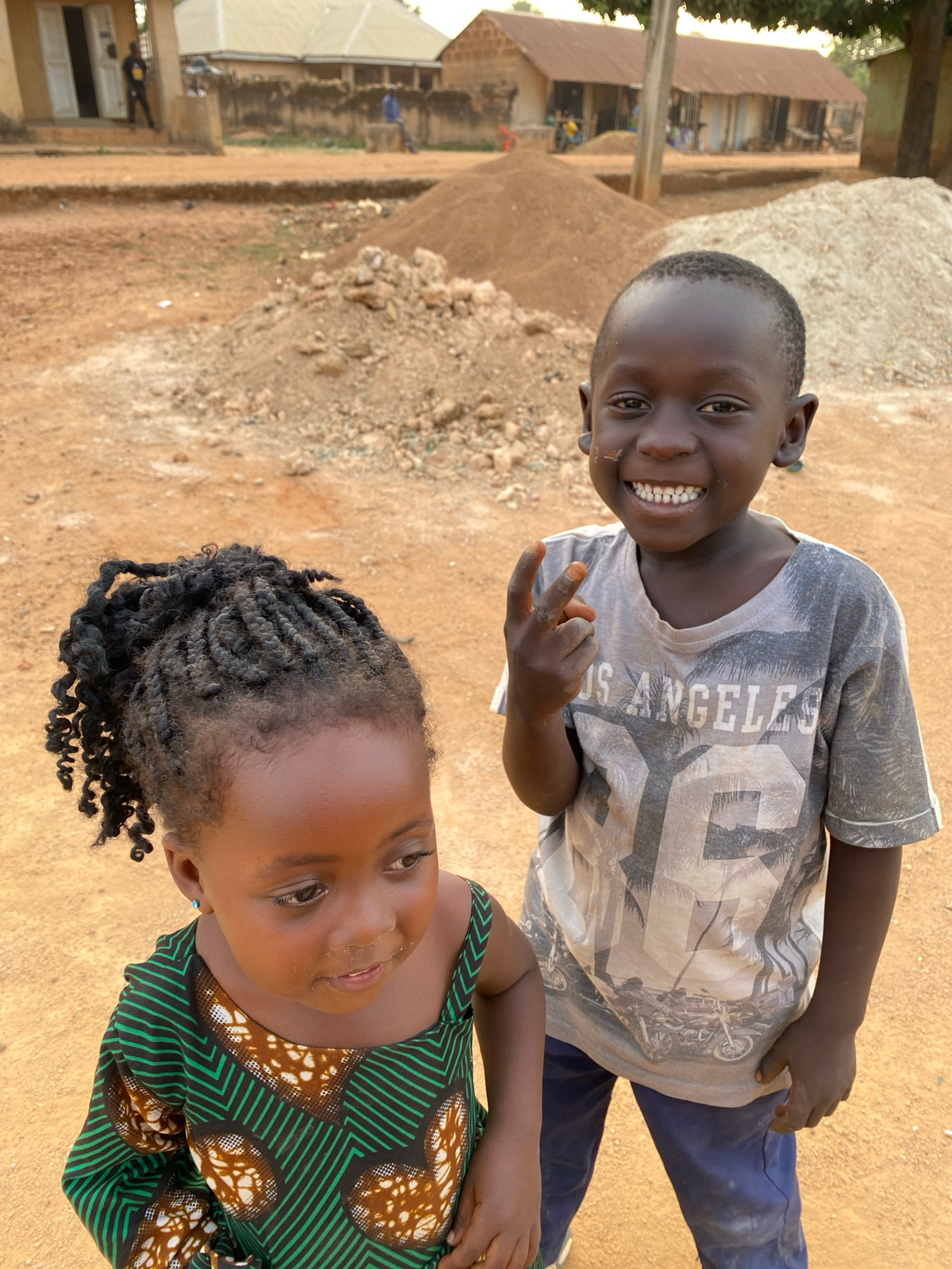 Two dark-skinned children, likely a boy and a girl, are posing for a photo outdoors in Kuru Dungus, Nigeria. The boy, on top, is wearing a grey t-shirt with "Los Angeles 96" printed on it and blue pan…read more