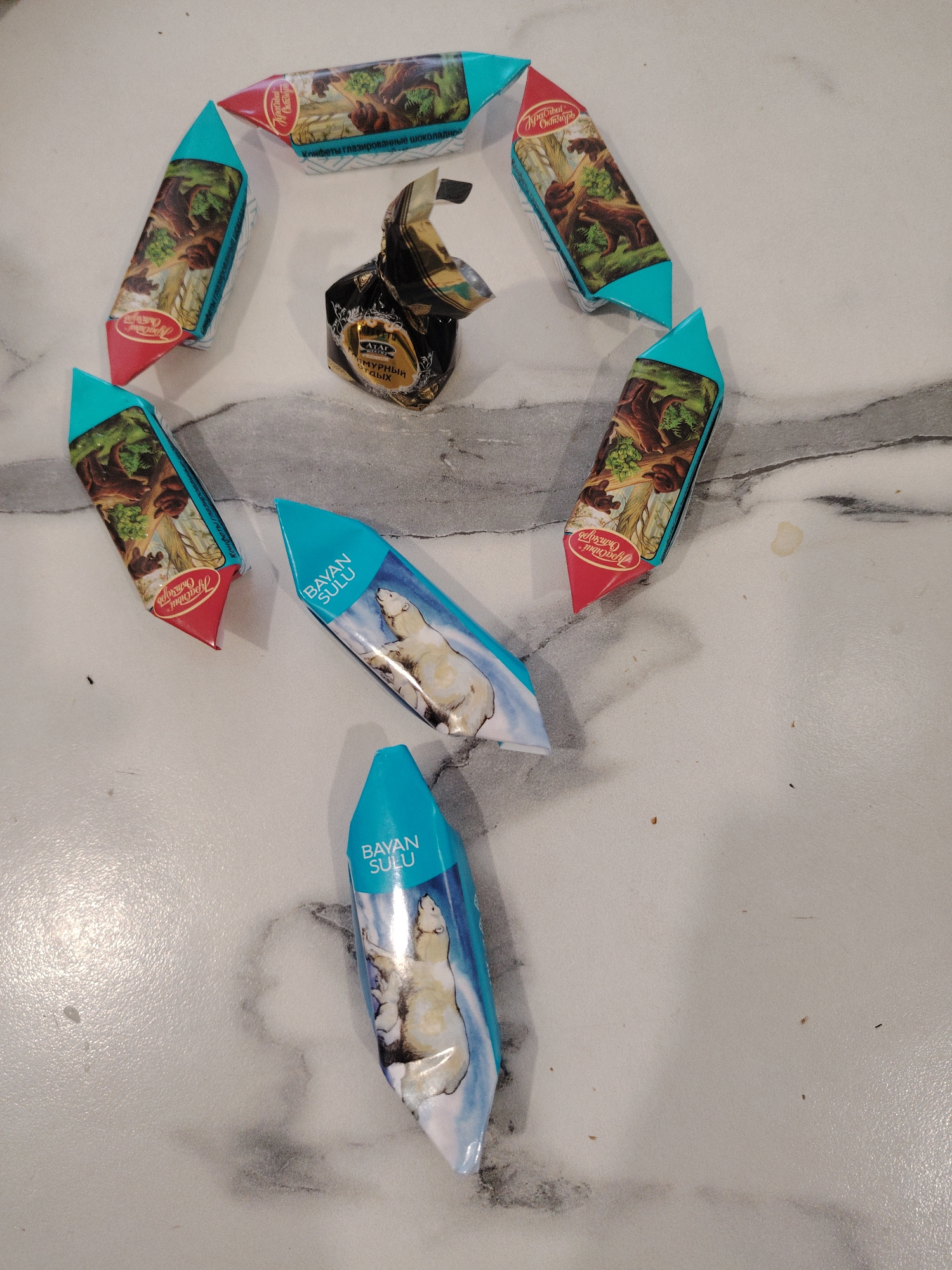 The image shows an arrangement of wrapped candies on a light-colored surface with a mottled pattern. Six candies with packaging depicting a bear in a forest setting are positioned in a circular fashio…read more