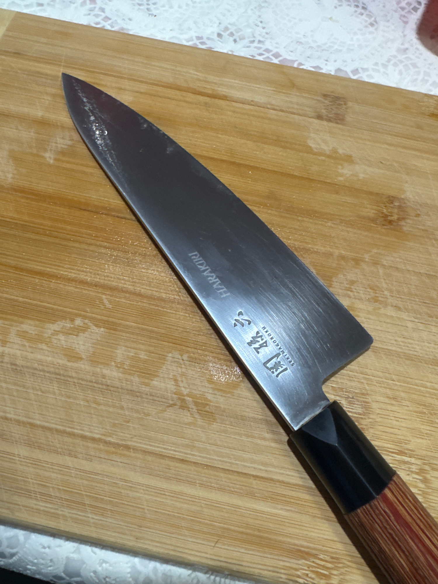 A Japanese-style knife is lying on a wooden cutting board. The knife has a silver blade with Japanese characters and the word "HARAKIRI" printed on it. The handle is made of wood with a black bolster.…read more
