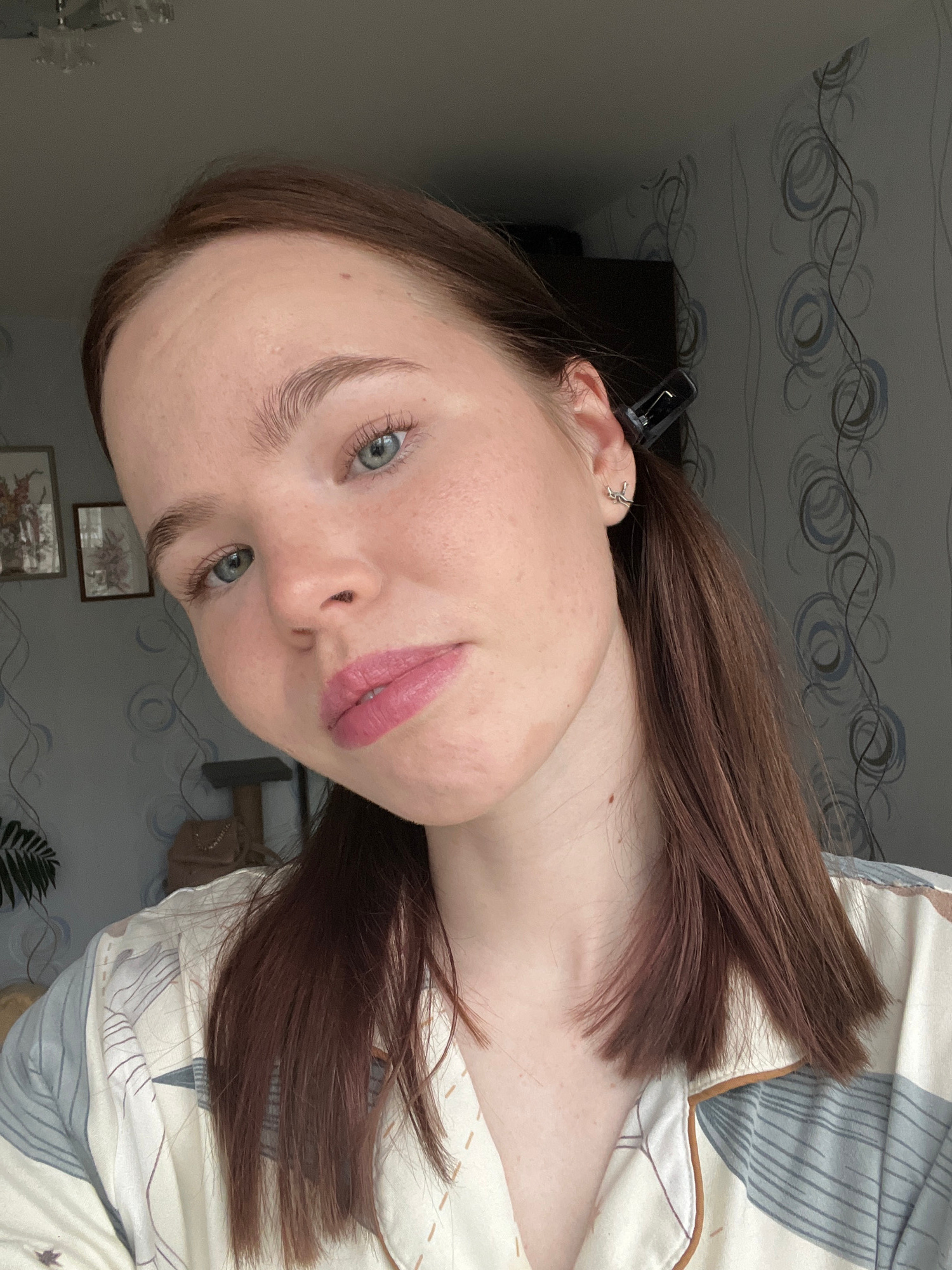 The image, rotated 90 degrees clockwise, features a young woman posing for a close-up indoor portrait. She has long, straight, medium brown hair, some of which is pulled back with a black clip visible…read more