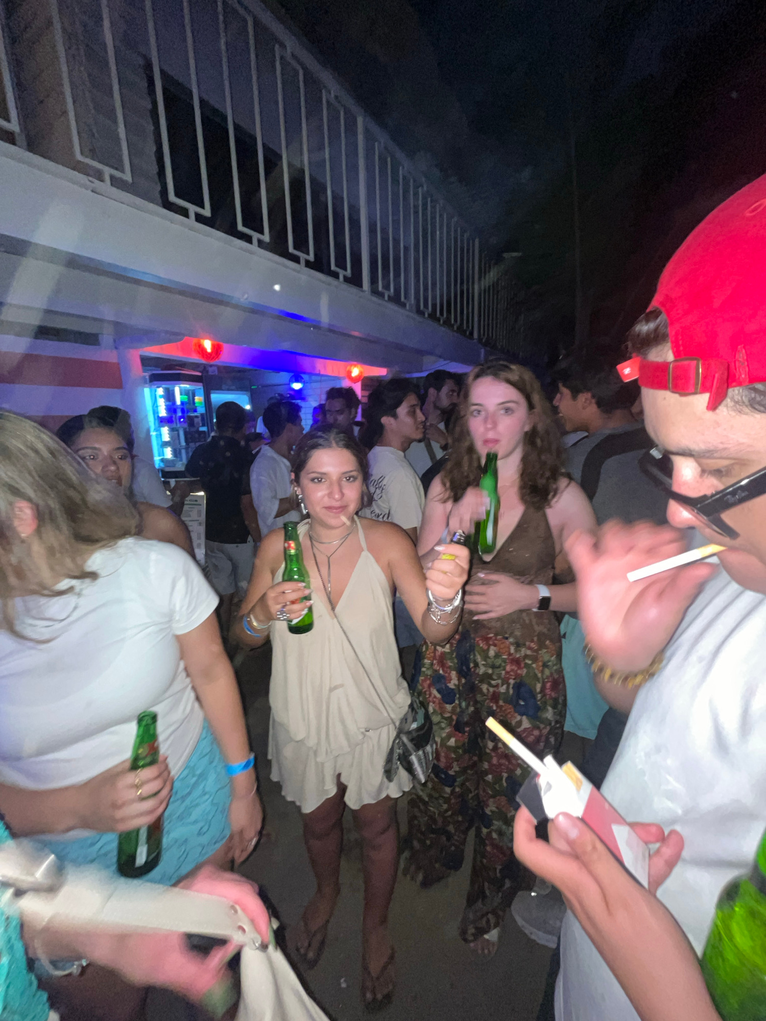 The image appears to depict a group of people at a gathering in Brisas de Zicatela, Mexico. Several individuals are holding green beer bottles. One person is holding a lit cigarette, while another hol…read more