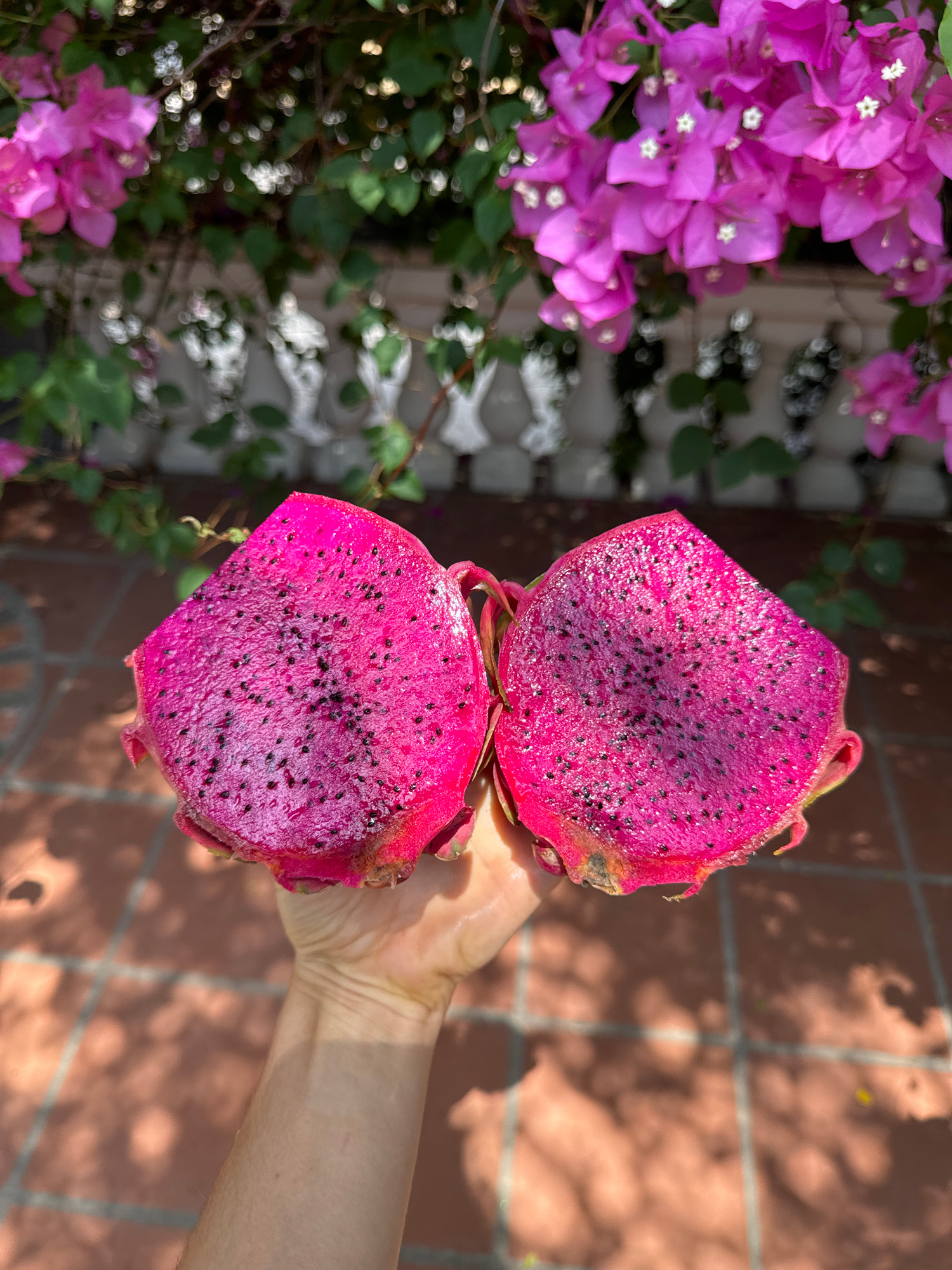 A person's hand holds a vibrantly colored dragon fruit, cut horizontally into two halves, revealing its deep magenta-purple flesh densely speckled with small black seeds. The fruit's outer skin is a r…read more