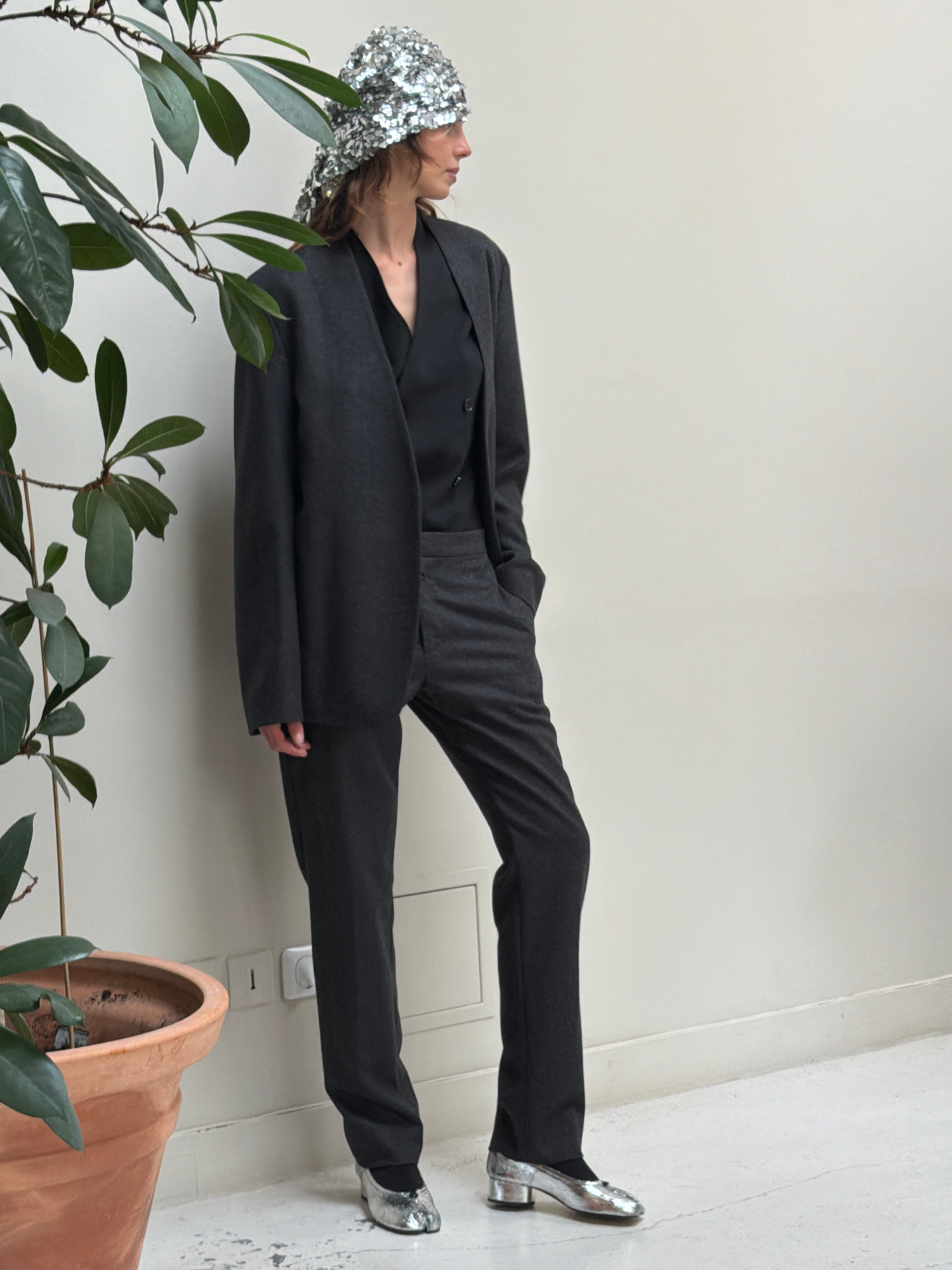 A woman in a gray suit and a sequined hat is posing in a room with white walls and a light-colored floor. She is wearing silver shoes. A large potted plant is in the foreground. A terracotta pot is vi…read more