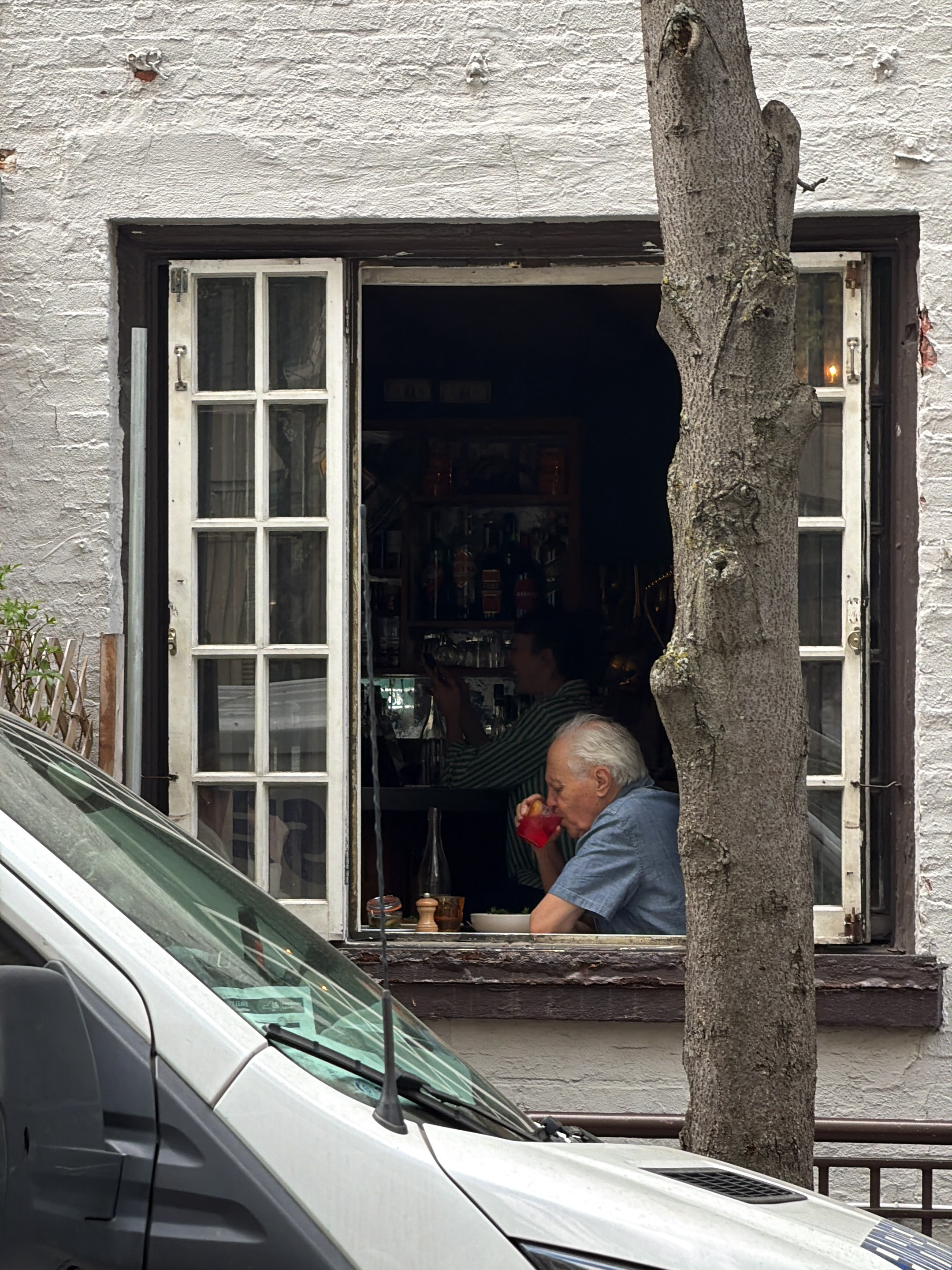 The image shows an exterior view of a restaurant window in New York City. An elderly man is seated inside, drinking from a red glass. Behind him, a person in a green-striped shirt stands behind a bar…read more