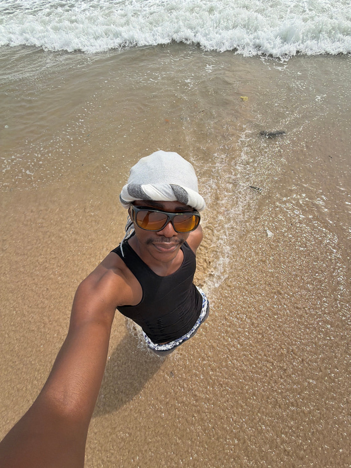 A single adult male is depicted in a selfie, standing in shallow ocean water at a beach in Alaguntan, Nigeria. The individual, dark-skinned with a mustache, wears a light gray and black striped head w…read more