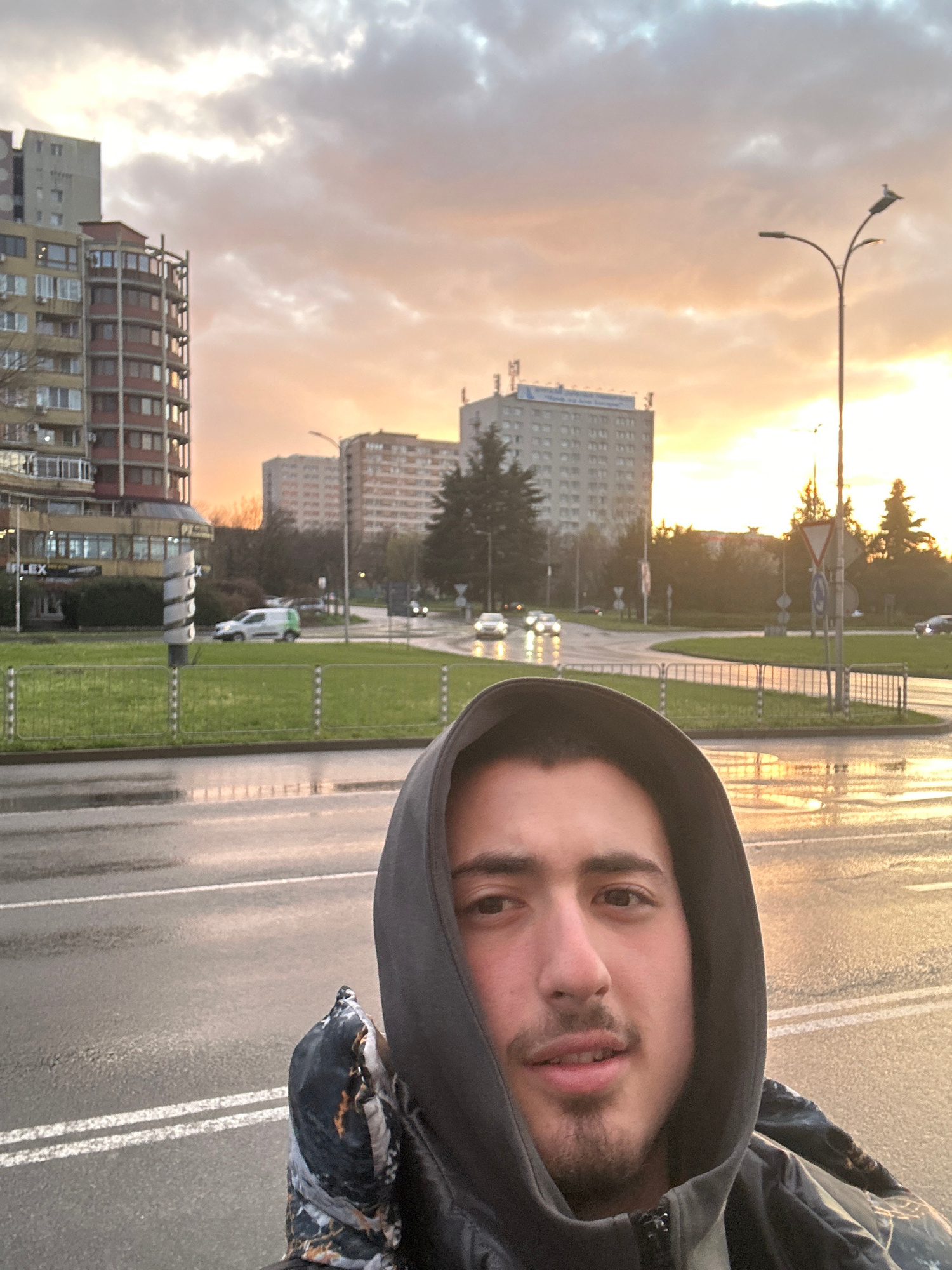 A man wearing a hooded jacket stands on a wet street in Burgas, Bulgaria, taking a selfie at sunset. Tall buildings line the street on the left. The scene includes street lights, road markings, green…read more