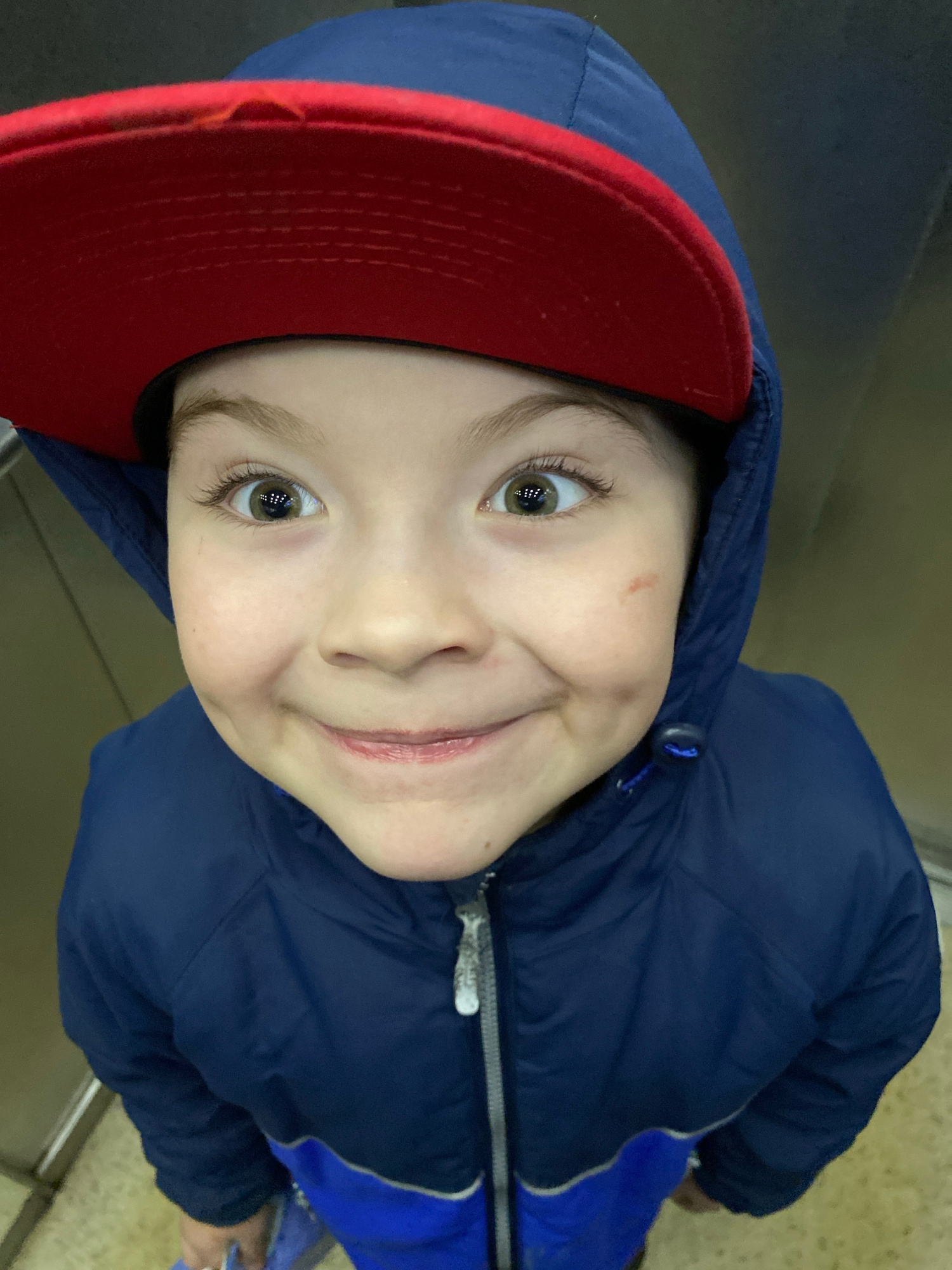 A young boy is looking up at the camera. He is wearing a navy blue hooded jacket and a red baseball cap. The setting appears to be indoors, potentially an elevator, as indicated by the neutral-colored…read more