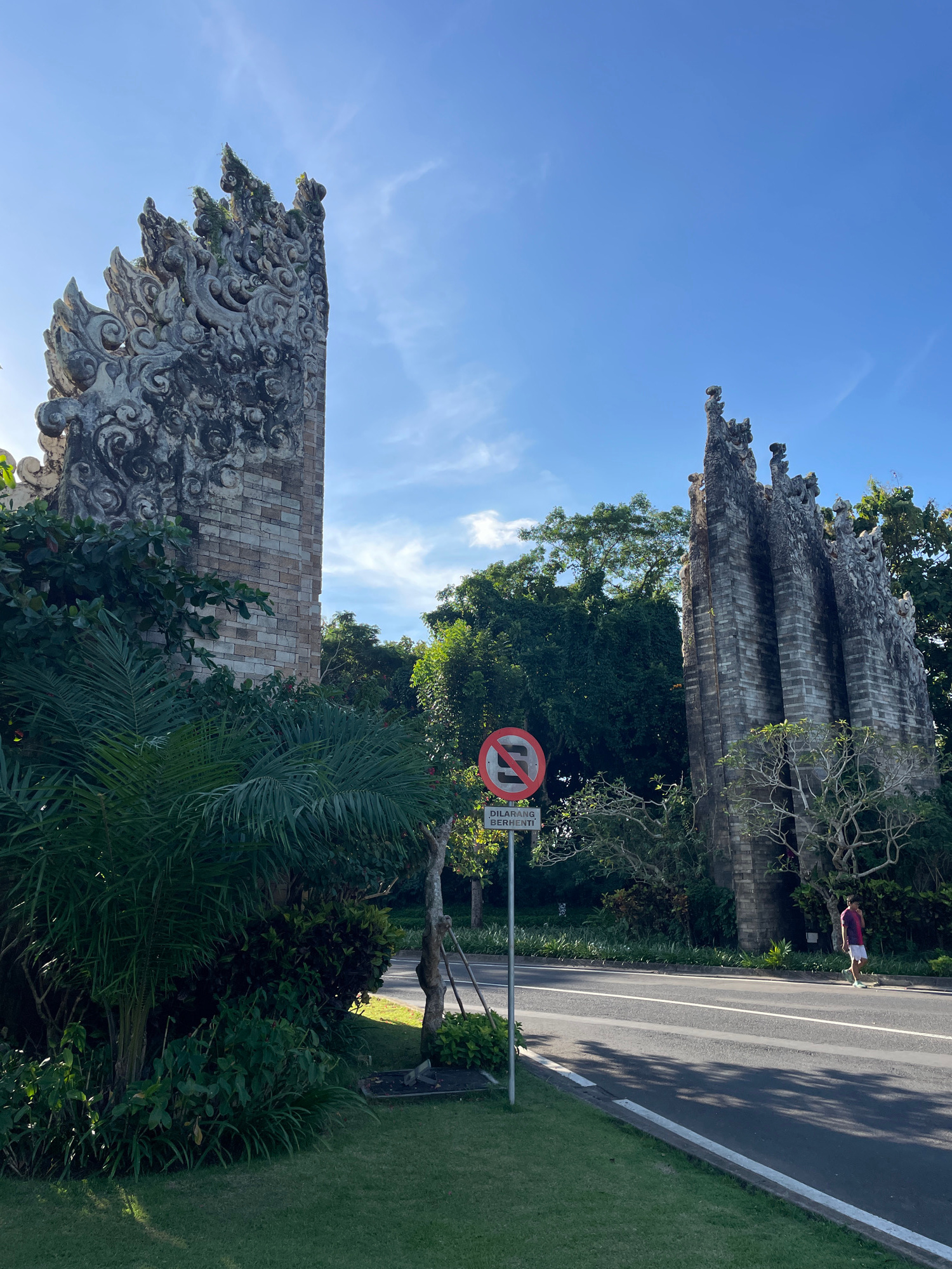 The image depicts a road flanked by elaborate stone structures, likely gates, in Kuta Selatan, Indonesia. The structures are intricately carved with traditional Balinese designs. A 'No Stopping' road…read more