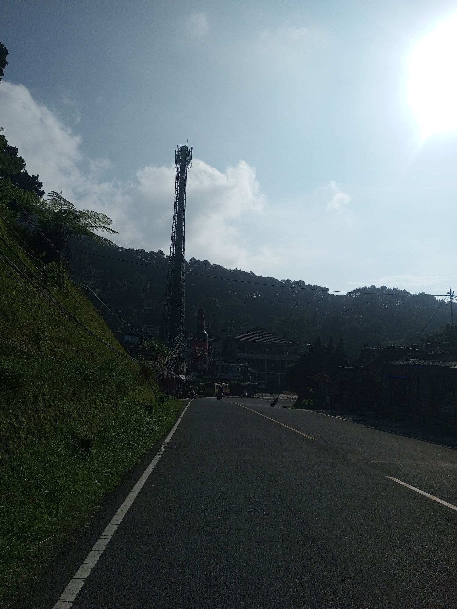 The image shows a road in what appears to be a rural or semi-rural area of Phouviang-Gnai, Laos. The road is asphalt and has white lane markings. A grassy slope rises on the left side of the road. Ove…read more