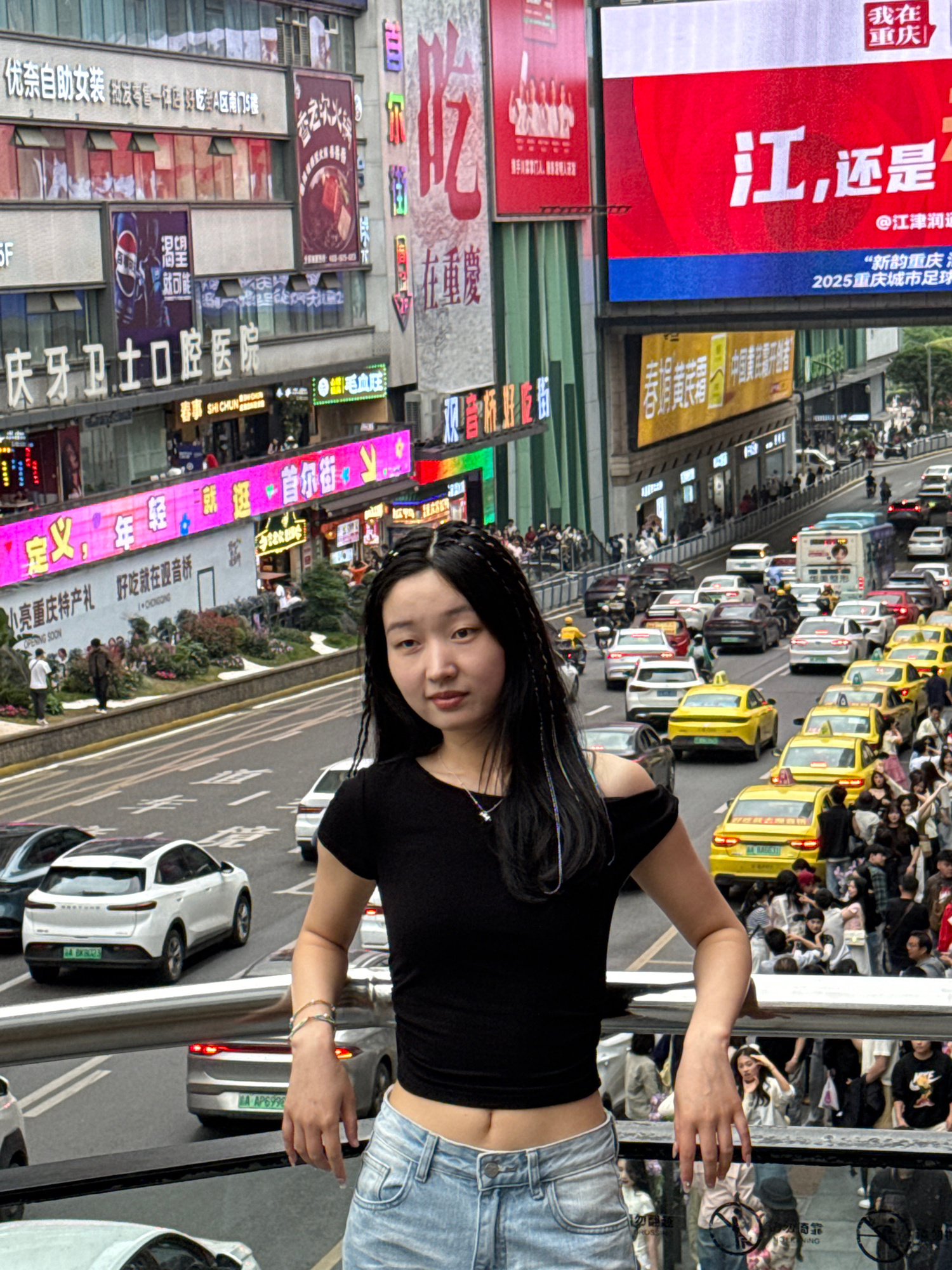 A young woman with dark hair and blue jeans is standing on a pedestrian walkway in Liangjiang, China, with her arms outstretched. She is positioned against the railing of the walkway, which overlooks…read more