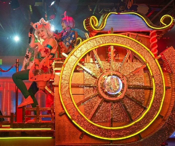 The scene depicts two female performers on an elaborate, multi-tiered stage prop within a performance venue in Shinjuku, Japan. The lighting is theatrical and colorful, predominantly red, blue, and yellow, with a bright white spotlight visible on the far left. The primary performer, positioned centrally on the left, is a female with light-colored hair styled with white, fur-like animal ears. She wears a sequined, peach-colored tunic with green and red floral patterns, green leggings, and light-colored shoes. A white garment with dark floral motifs drapes over her left shoulder, and a turquoise band encircles her right bicep. She holds a black microphone in her left hand, raises her right hand, and directs a smiling gaze towards the viewer. Her posture suggests a dynamic movement, with one leg bent as if stepping onto a higher platform. Behind and slightly to the right of the primary performer, a second female performer is partially visible. She has pink-purple hair styled with small accessories and wears a blue and gold patterned costume. She also holds a microphone. The right side of the image is dominated by a large, ornate golden wheel, approximately one-quarter of its diameter visible. The wheel is textured with glitter-like material, and its outer rim and an inner circular spoke are outlined with bright yellow neon lighting. Its central hub features a circular display or orb containing a miniature landscape scene. This wheel is integrated into a larger, gold-colored stage structure, which extends upwards to include a curved, blue-ridged section outlined in yellow neon, resembling a stylized mustache, and red spiral columns. A red velvet-roped barrier is visible on the far left, completing the theatrical setting. | Open Wire