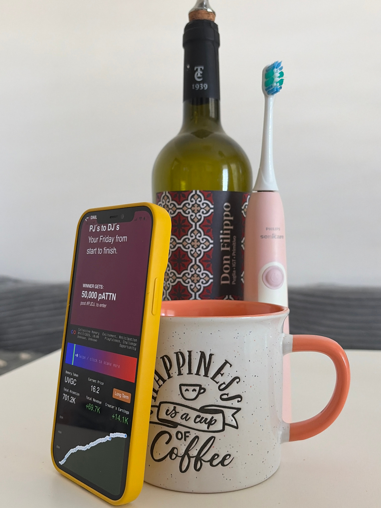The image displays an arrangement of everyday items lying horizontally on a light-colored surface, likely a table or counter. The objects, from back to front, include a green wine bottle, a pink and white electric toothbrush, a white and orange coffee mug, and a smartphone in a yellow case. The wine bottle has a black label featuring "Don Filippo" and "Puglia IGT Primitivo," with the year "1939" also visible. It is topped with a cork. Resting partially on the wine bottle's label is a pink Philips Sonicare electric toothbrush, showing its blue and green bristles and the Philips Sonicare branding. To the right, a white speckled coffee mug with an orange handle is visible. Its side is adorned with text, part of which reads, "HAPPINESS is a cup Coffee." In the foreground, angled towards the viewer, is a smartphone in a bright yellow protective case. Its screen is illuminated, displaying what appear to be two different application interfaces. One section, labeled "DAIL," features "PJ's to DJ's" and the text "Your Friday from start to finish." It advertises a contest: "WINNER GETS: 50,000 PATTN" and instructs to "post #PJDJ. to enter." This app also lists keywords such as "Collective Memory," "Excitement, Anticipation," "Playfulness, Challenge," and "Opportunity," with a date "04/17/2026, 18:00." The other section of the screen shows financial or crypto-related data under "Memory Token UVGC," with a "Current Price 16.2," "Total Attention 701.2K," "Total Revenue +69.7K," and "Creator's Earnings +14.1K," accompanied by a graph showing a positive, upward trend over the "Long Term." The scene captures a blend of personal care, leisure, and digital activity, set in what is understood to be Budva, Montenegro. | Open Wire